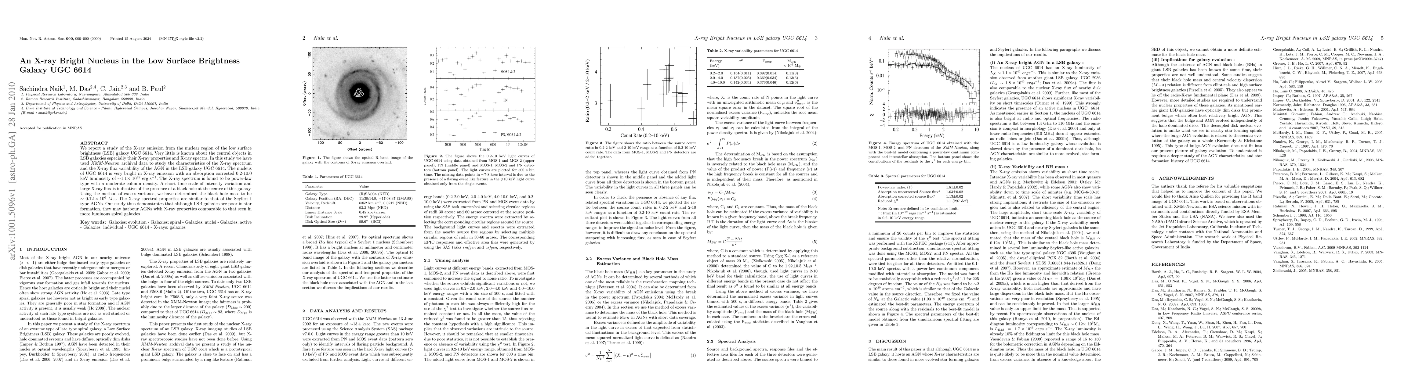 We report a study of the X-ray emission from the nuclear region of the low surface brightness (LSB) galaxy UGC 6614. Very little is known about the central objects in LSB galaxies especially their X-ray properties and X-ray spectra. In this study we have used XMM-Newton archival data to study the characteristics of the X-ray spectrum and the X-ray flux variability of the AGN in the LSB galaxy UGC 6614. The nucleus of UGC 6614 is very bright in X-ray emission with an absorption corrected 0.2-10.0 keV luminosity of ~1.1 x 10^{42} erg s^{-1}. The X-ray spectrum is found to be power-law type with a moderate column density. A short time scale of intensity variation and large X-ray flux is indicative of the presence of a black hole at the centre of this galaxy. Using the method of excess variance, we have determined the black hole mass to be ~0.12 x 10^{6} solar mass. The X-ray spectral properties are similar to that of the Seyfert I type AGNs. Our study thus demonstrates that although LSB galaxies are poor in star formation, they may harbour AGNs with X-ray properties comparable to that seen in more luminous spiral galaxies.