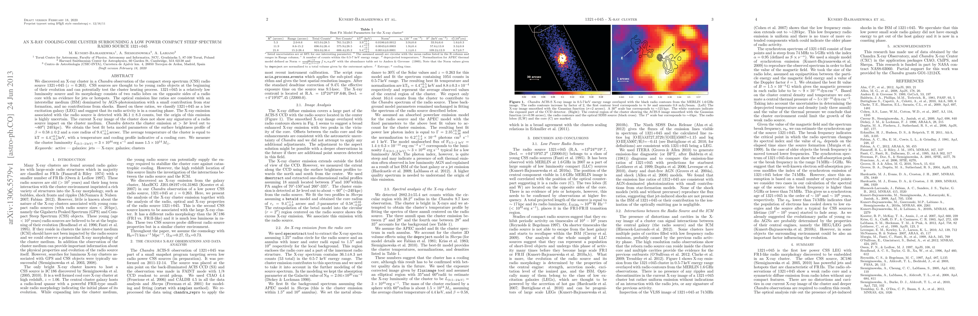 We discovered an X-ray cluster in a Chandra observation of the compact steep spectrum (CSS) radio source 1321+045 (z=0.263). CSS sources are thought to be young radio objects at the beginning of their evolution and can potentially test the cluster heating process. 1321+045 is a relatively low luminosity source and its morphology consists of two radio lobes on the opposite sides of a radio core with no evidence for jets or hotspots. The optical emission line ratios are consistent with an interstellar medium (ISM) dominated by AGN-photoionization with a small contribution from star formation, and no contributions from shocks. Based on these ratios, we classify 1321+045 as a low excitation galaxy (LEG) and suggest that its radio activity is in a coasting phase. The X-ray emission associated with the radio source is detected with 36.1+/-8.3 counts, but the origin of this emission is highly uncertain. The current X-ray image of the cluster does not show any signatures of a radio source impact on the cluster medium. Chandra detects the cluster emission at >3 sigma level out to ~60 arcsec (~240 kpc). We obtain the best fit beta model parameters of the surface brightness profile of beta=0.58+/-0.2 and a core radius of 9.4^{+1.1}_{-0.9} arcsec. The average temperature of the cluster is equal to kT=4.4^{+0.5}_{-0.3} keV, with a temperature and cooling profile indicative of a cooling core. We measure the cluster luminosity L_(0.5-2 keV)=3x10^{44} erg s^{-1} and mass 1.5x10^{14} M_sun.