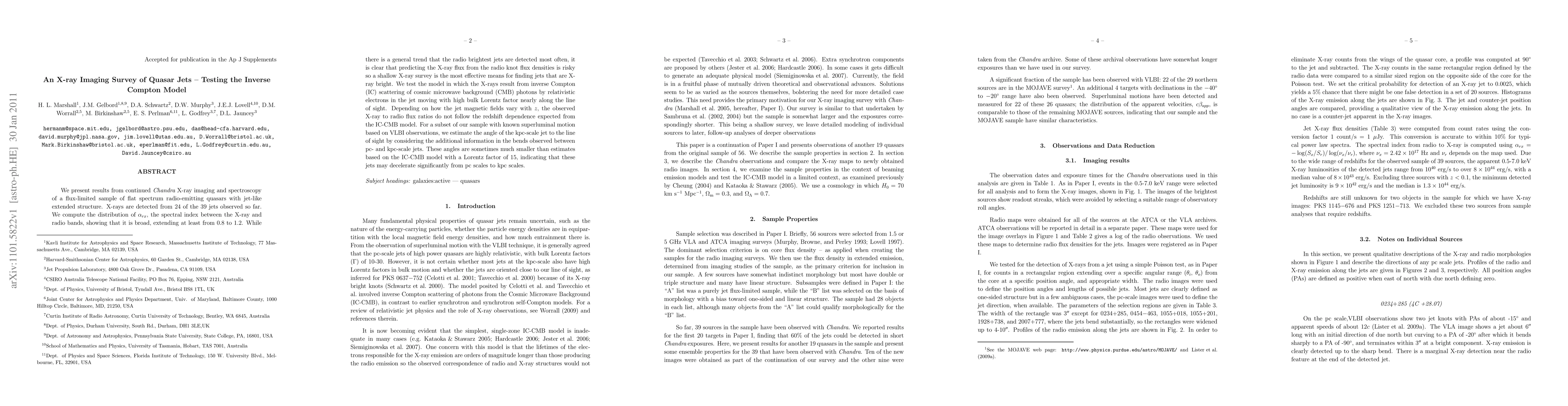 We present results from continued Chandra X-ray imaging and spectroscopy of a flux-limited sample of flat spectrum radio-emitting quasars with jet-like extended structure. X-rays are detected from 24 of the 39 jets observed so far. We compute the distribution of alpha_rx, the spectral index between the X-ray and radio bands, showing that it is broad, extending at least from 0.8 to 1.2. While there is a general trend that the radio brightest jets are detected most often, it is clear that predicting the X-ray flux from the radio knot flux densities is risky so a shallow X-ray survey is the most effective means for finding jets that are X-ray bright. We test the model in which the X-rays result from inverse Compton (IC) scattering of cosmic microwave background (CMB) photons by relativistic electrons in the jet moving with high bulk Lorentz factor nearly along the line of sight. Depending on how the jet magnetic fields vary with z, the observed X-ray to radio flux ratios do not follow the redshift dependence expected from the IC-CMB model. For a subset of our sample with known superluminal motion based on VLBI observations, we estimate the angle of the kpc-scale jet to the line of sight by considering the additional information in the bends observed between pc- and kpc-scale jets. These angles are sometimes much smaller than estimates based on the IC-CMB model with a Lorentz factor of 15, indicating that these jets may decelerate significantly from pc scales to kpc scales.