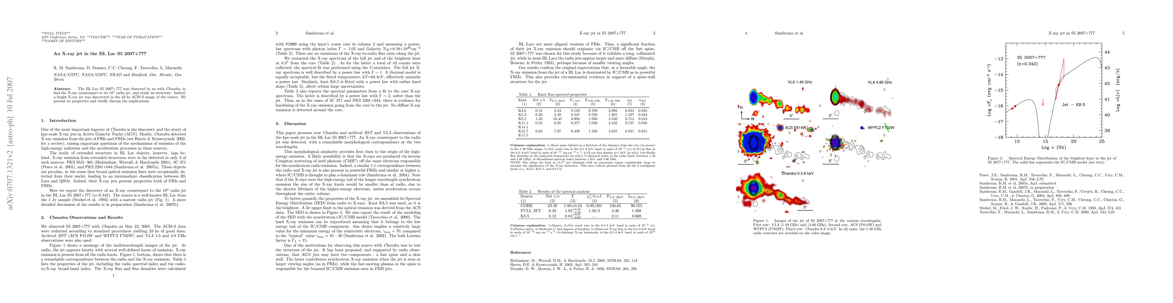 The BL Lac S5 2007+777 was observed by us with Chandra, to find the X-ray counterpart to its 18" radio jet, and study its structure. Indeed, a bright X-ray jet was discovered in the 33 ks ACIS-S image of the source. We present its properties and briefly discuss the implications.