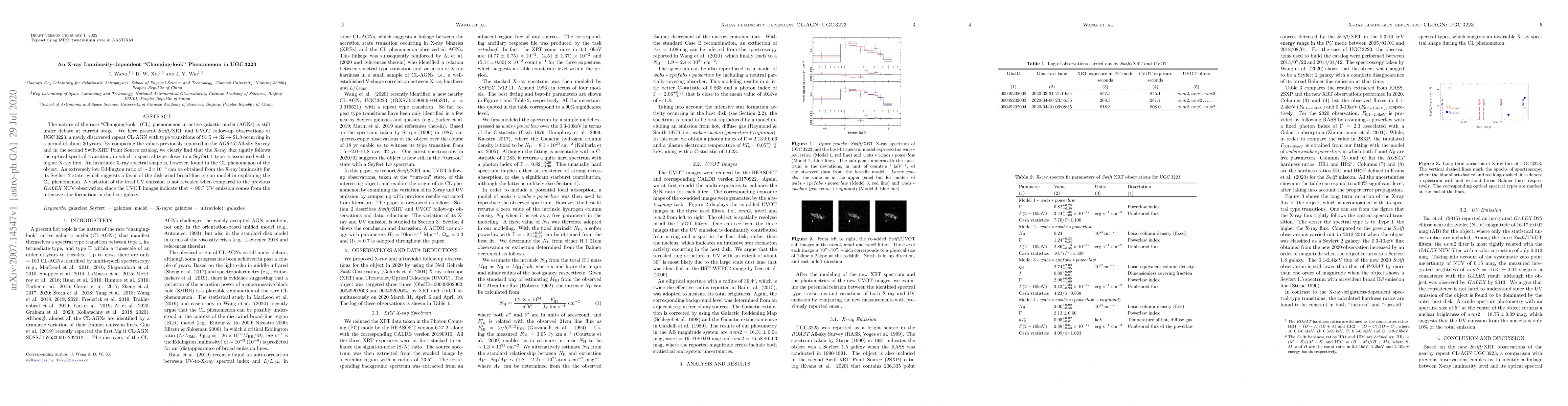 The nature of the rare "Changing-look" (CL) phenomenon in active galactic nuclei (AGNs) is still under debate at current stage. We here present \it Swift/\rm XRT and UVOT follow-up observations of UGC\,3223, a newly discovered repeat CL-AGN with type transitions of $\mathrm{S1.5\rightarrow S2 \rightarrow S1.8}$ occurring in a period of about 30 years. By comparing the values previously reported in the \it ROSAT \rm All-sky Survey and in the second Swift-XRT Point Source catalog, we clearly find that the X-ray flux tightly follows the optical spectral transition, in which a spectral type closer to a Seyfert 1 type is associated with a higher X-ray flux. An invariable X-ray spectral shape is, however, found in the CL phenomenon of the object. An extremely low Eddington ratio of $\sim2\times10^{-4}$ can be obtained from the X-ray luminosity for its Seyfert 2 state, which suggests a favor of the disk-wind broad-line region model in explaining the CL phenomenon. A variation of the total UV emission is not revealed when compared to the previous \it GALEX \rm NUV observation, since the UVOT images indicate that $\sim90$\% UV emission comes from the intensive star formation in the host galaxy.