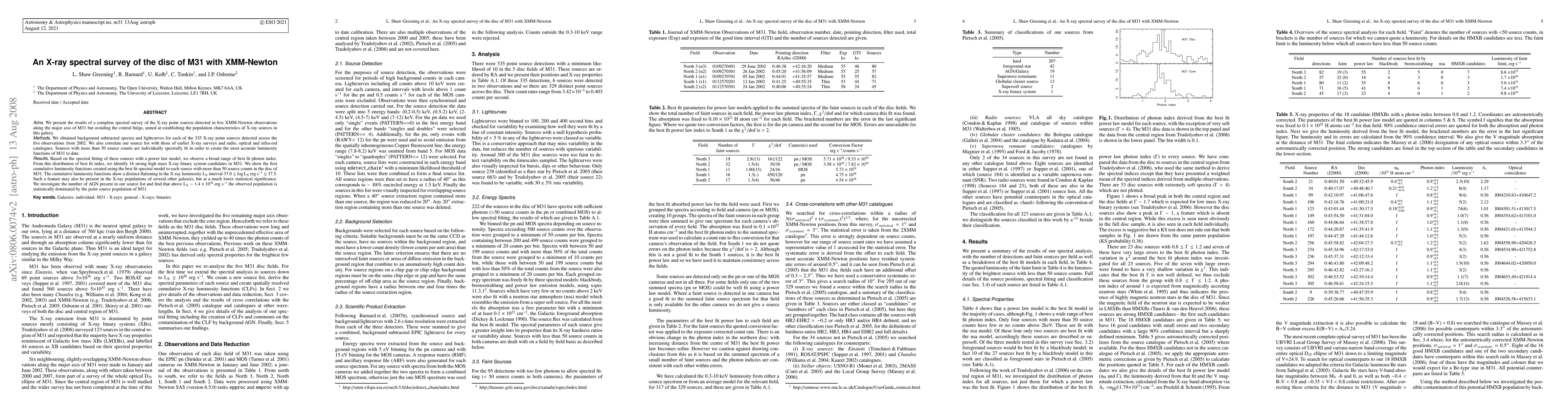 We present the results of a complete spectral survey of the X-ray point sources detected in five XMM-Newton observations along the major axis of M31 but avoiding the central bulge, aimed at establishing the population characteristics of X-ray sources in this galaxy. We obtained background subtracted spectra and lightcurves for each of the 335 X-ray point sources detected across the five observations from 2002. We also correlate our source list with those of earlier X-ray surveys and radio, optical and infra-red catalogues. Sources with more than 50 source counts are individually spectrally fit in order to create the most accurate luminosity functions of M31 to date. Based on the spectral fitting of these sources with a power law model, we observe a broad range of best fit photon index. From this distribution of best fit index, we identify 16 strong high mass X-ray binary system candidates in M31. We show the first cumulative luminosity functions created using the best fit spectral model to each source with more than 50 source counts in the disc of M31. The cumulative luminosity functions show a prominent, statistically significant flattening in the X-ray luminosity LX interval 37.0 \lesssim log LX erg s-1 \lesssim 37.5. Such a feature may also be present in the X-ray populations of several other galaxies, but at a much lower statistical significance. We investigate the number of AGN present in our source list and find that above LX ~1.4x1036 erg s-1 the observed population is statistically dominated by the point source population of M31.