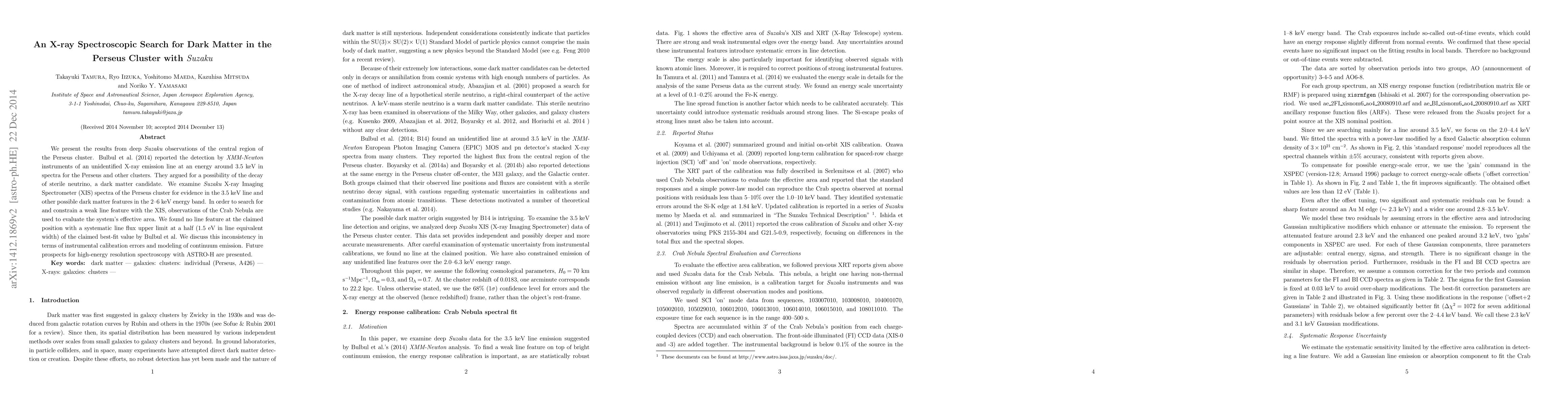 This paper reports on Suzaku observations of the Perseus cluster, seeking evidence for an unidentified 3.5 keV X-ray line previously detected by XMM-Newton, which could indicate dark matter. The study found no such line, suggesting potential calibration or modeling issues, and outlines future prospects for ASTRO-H.