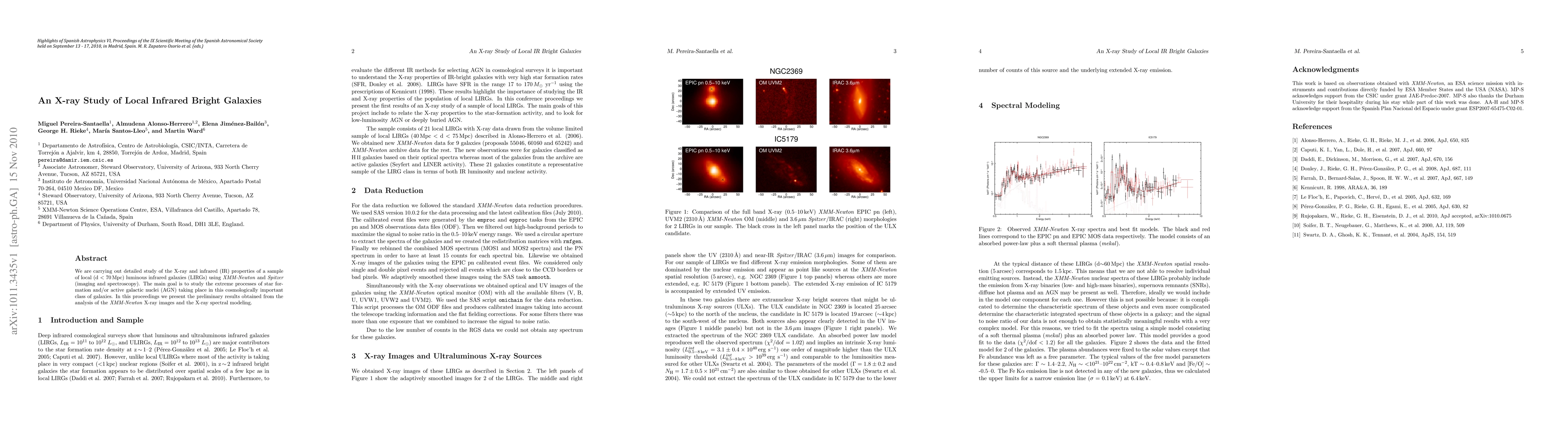 We are carrying out detailed study of the X-ray and infrared (IR) properties of a sample of local (d < 70 Mpc) luminous infrared galaxies (LIRGs) using XMM-Newton and Spitzer (imaging and spectroscopy). The main goal is to study the extreme processes of star formation and/or active galactic nuclei (AGN) taking place in this cosmologically important class of galaxies. In this proceedings we present the preliminary results obtained from the analysis of the XMM-Newton X-ray images and the X-ray spectral modeling.
