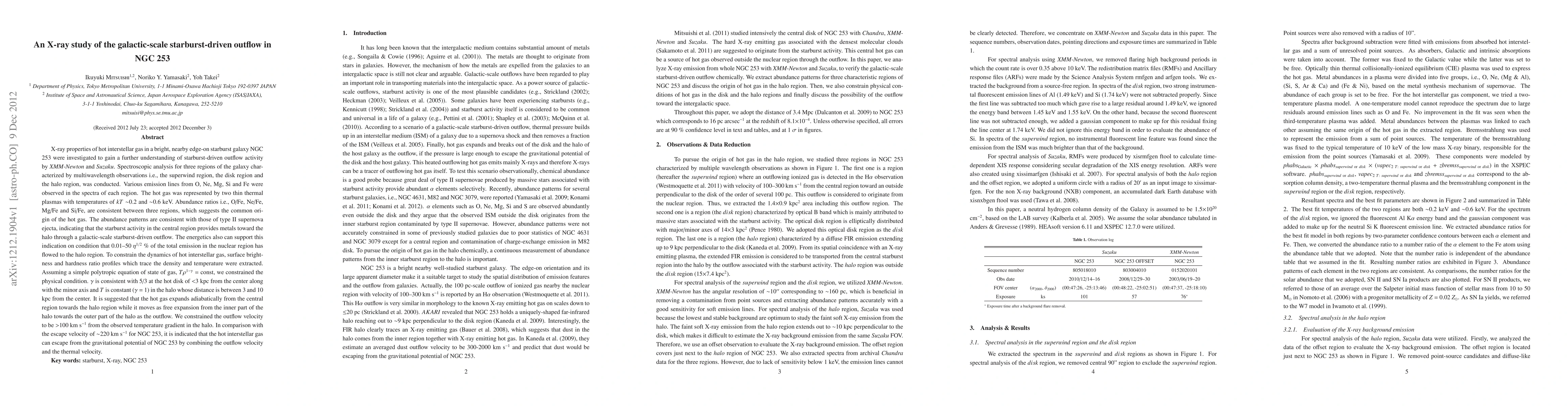 This study uses XMM-Newton and Suzaku data to investigate the X-ray properties of starburst-driven outflows in NGC 253, revealing two thermal plasmas and consistent elemental abundances suggesting a common origin. The outflow velocity is constrained to be >100 km s^-1, sufficient to escape the galaxy's gravitational potential.