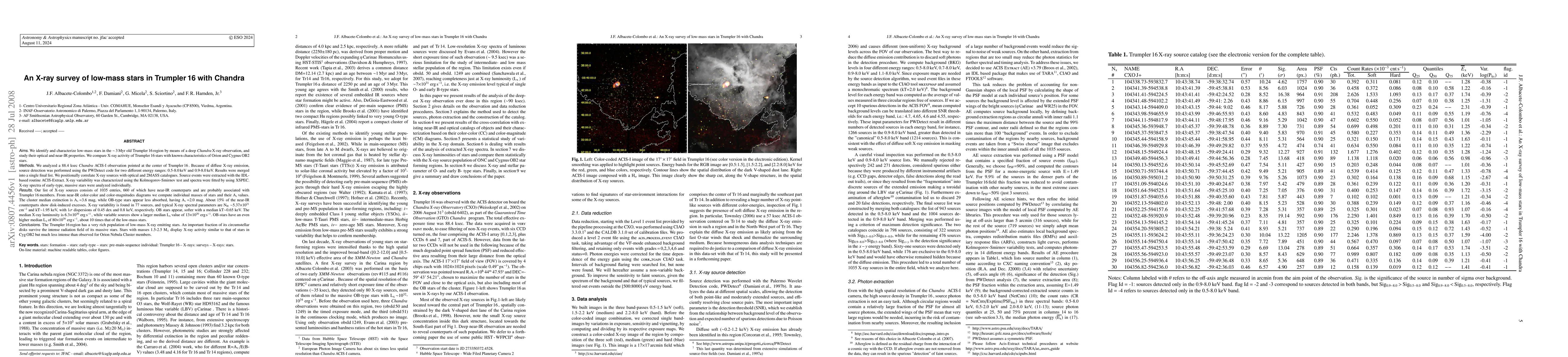 We identify and characterize low-mass stars in the ~3 Myr old Trumpler 16 (Tr16) region by means of a deep Chandra X-ray observation, and study their optical and near-IR properties. We compare X-ray activity of Tr16 stars with known characteristics of Orion and Cygnus OB2 stars. We analyzed a 88.4 ksec Chandra ACIS-I observation pointed at the center of Tr16. Because of diffuse X-ray emission, source detection was performed using the PWDetect code for two different energy ranges: 0.5-8.0 keV and 0.9-8.0 keV. Results were merged into a single final list. We positionally correlate X-ray sources with optical and 2MASS catalogues. Source events were extracted with the IDL-based routine ACIS-Extract. X-ray variability was characterized using the Kolmogorov-Smirnov test and spectra were fitted by using XSPEC. X-ray spectra of early-type, massive stars were analyzed individually. Our list of X-ray sources consists of 1035 entries, 660 of which have near-IR counterparts and are probably associated with Tr16 members. From near-IR color-color and color-magnitudes diagrams we compute individual masses of stars and their Av values. About 15% of the near-IR counterparts show disk-induced excesses. X-ray variability is found in 77 sources. X-ray emission from OB stars appear softer than the low-mass stars. The Tr16 region has a very rich population of low-mass X-ray emitting stars. An important fraction of its circumstellar disks survive the intense radiation field of its massive stars. Stars with masses 1.5-2.5 Mo display X-ray activity similar to that of stars in Cyg OB2 but much less intense than observed for Orion Nebula Cluster members.