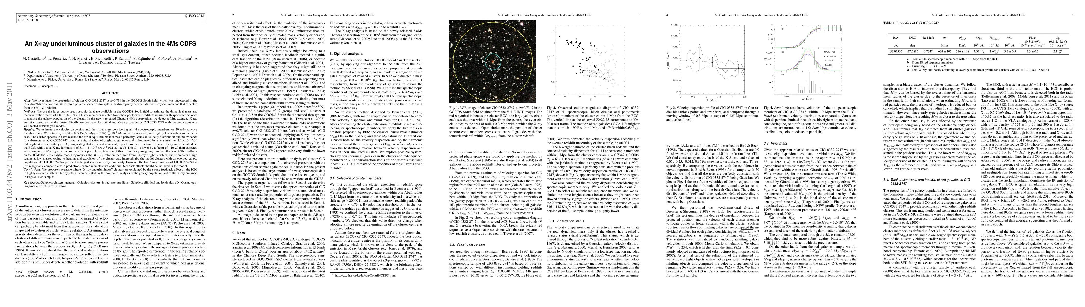 [Abridged] We use the large public spectroscopic database available in the GOODS-South field to estimate the dynamical mass and the virialization status of cluster ClG 0332-2747 at z=0.734. Cluster members selected from their photometric redshift are used with spectroscopic ones to analyse the galaxy population of the cluster. In the newly released Chandra 4Ms observations we detect a faint extended X-ray emission associated to the cluster. Finally, we compare the optical and X-ray properties of ClG 0332-2747 with the predictions of a well tested semianalytic model. We estimate the velocity dispersion and the virial mass considering all 44 spectroscopic members, or 20 red-sequence members only. We obtain sigma_v=634 +/- 105 Km/s, M_200=3.07 ^{+1.57}_{-1.16}~10^{14} M_sun in the former case, and slightly lower values in the latter case. The cluster appears to have reached the virial equilibrium: it shows a perfectly Gaussian velocity distribution and no evidence for substructures. ClG 0332-2747 contains a high fraction of bright red galaxies, and is dominated by a very massive (1.1 x 10^{12} M_sun) old brightest cluster galaxy (BCG), suggesting that it formed at an early epoch. We detect a faint extended X-ray source centered on the BCG, with a total X-ray luminosity of L_X ~ 2 x 10^{42} erg s^-1 (0.1-2.4 keV). This L_X is lower by a factor of ~10-20 than expected according to the M-L_X relation. We provide a possible explanation of this discrepancy as due to the effects of AGN feedback on the ICM: the semianalytic model reproduces the M-L_X relation measured from "X-ray bright" clusters, and it predicts a high scatter at low masses due to heating and expulsion of the cluster gas. Interestingly, in the model clusters with an evolved galaxy population like ClG 0332-2747 present the largest scatter in X-ray luminosity.