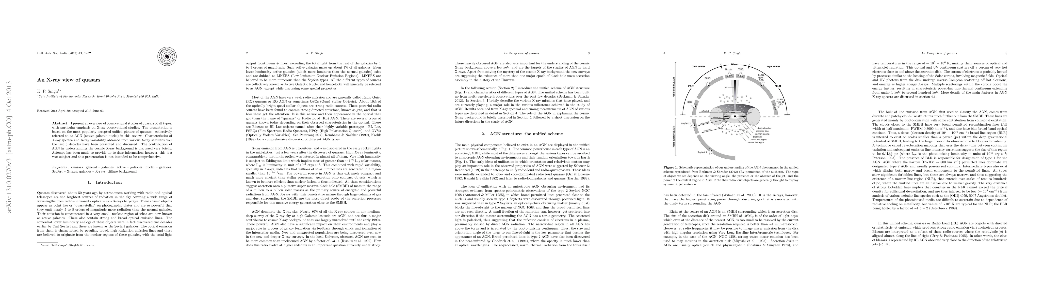 I present an overview of observational studies of quasars of all types, with particular emphasis on X-ray observational studies. The presentation is based on the most popularly accepted unified picture of quasars - collectively referred to as AGN (active galactic nuclei) in this review. Characteristics of X-ray spectra and X-ray variability obtained from various X-ray satellites over the last 5 decades have been presented and discussed. The contribution of AGN in understanding the cosmic X-ray background is discussed very briefly. Attempt has been made to provide up-to-date information; however, this is a vast subject and this presentation is not intended to be comprehensive.