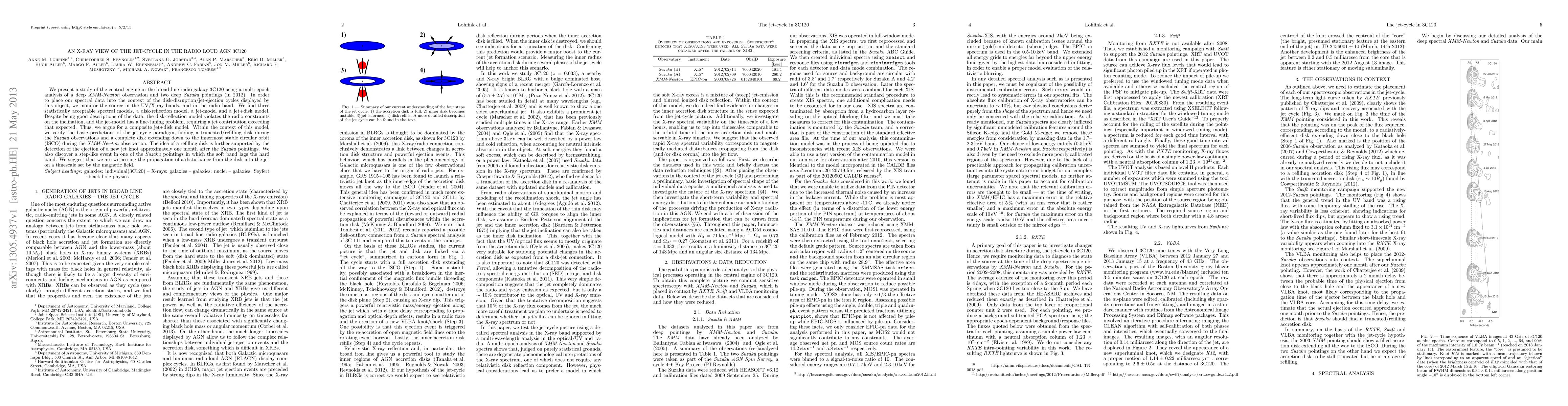 The study of radio loud AGN 3C120 using XMM-Newton and Suzaku data reveals a composite jet+disk model, supporting the jet-cycle paradigm. Key findings include a truncated disk during Suzaku observations, a full disk down to ISCO during XMM-Newton observation, detection of a new jet knot post-Suzaku, and a step-like event indicating disturbance propagation from the disk to the jet.
