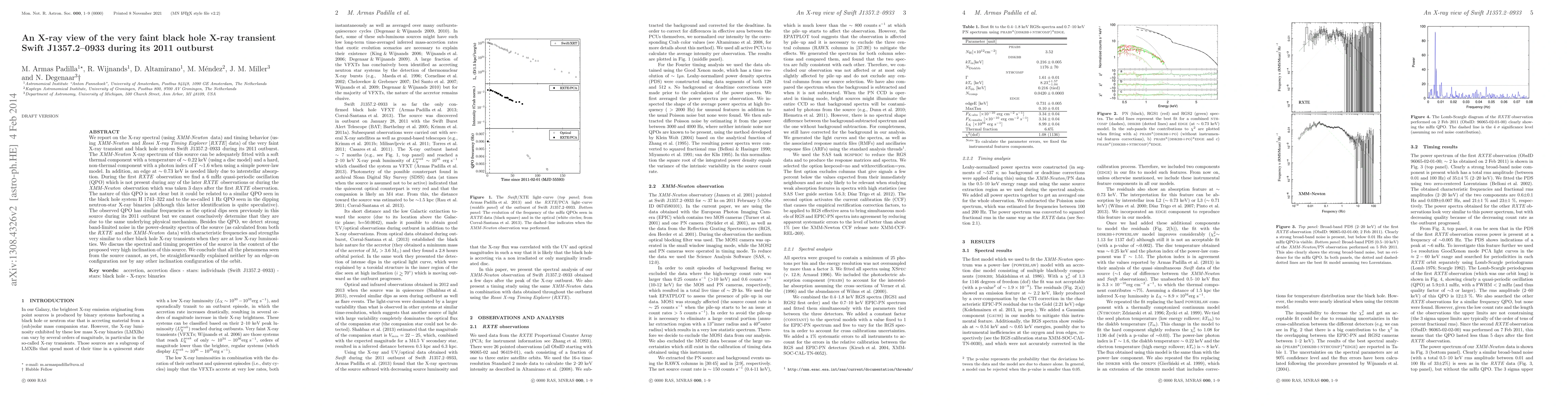 This paper analyzes the X-ray spectral and timing behavior of the faint black hole transient Swift J1357.2-0933 during its 2011 outburst, revealing a soft thermal component and a hard non-thermal component, along with a quasi-periodic oscillation (QPO) at 6 mHz. The QPO's nature remains unclear, but it may relate to phenomena seen in other black hole systems.