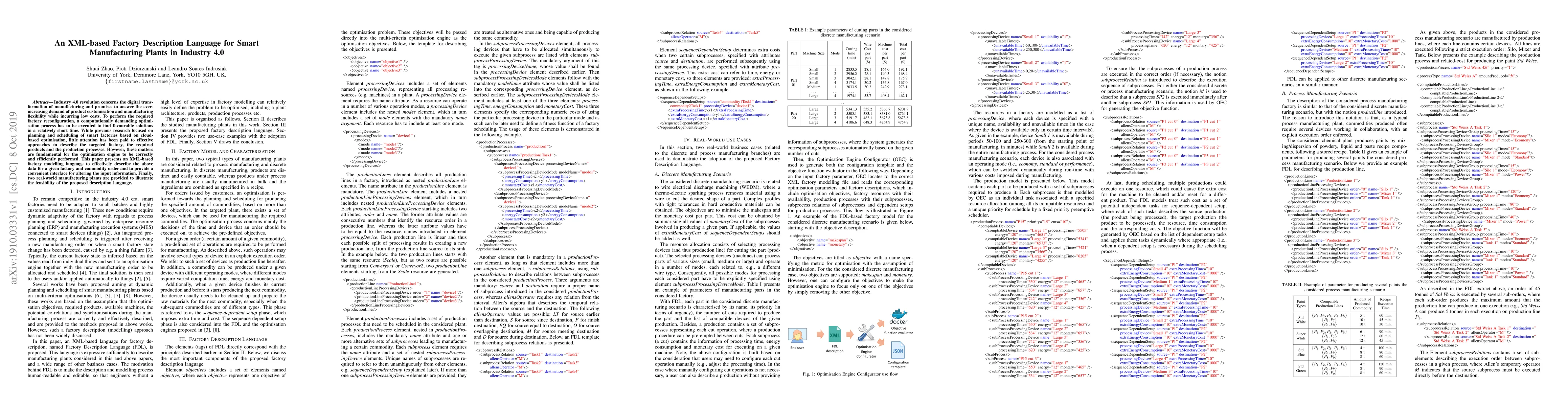 Industry 4.0 revolution concerns the digital transformation of manufacturing and promises to answer the ever-increasing demand of product customisation and manufacturing flexibility while incurring low costs. To perform the required factory reconfiguration, a computationally demanding optimisation process has to be executed to find favourable solutions in a relatively short time. While previous research focused on planning and scheduling of smart factories based on cloud-based optimisation, little attention has been paid to effective approaches to describe the targeted factory, the required products and the production processes. However, these matters are fundamental for the optimisation engine to be correctly and efficiently performed. This paper presents an XML-based factory modelling language to effectively describe the above data for a given factory and commodity order and to provide a convenient interface for altering the input information. Finally, two real-world manufacturing plants are provided to illustrate the feasibility of the proposed description language.