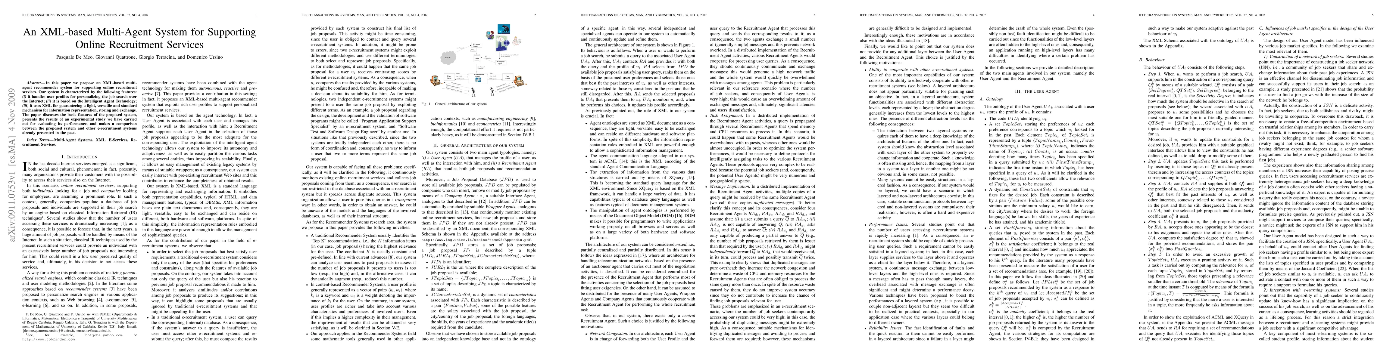 This paper proposes an XML-based multi-agent recommender system for online recruitment services, featuring personalized job searches and Intelligent Agent Technology. The system uses XML for standardized information representation and was evaluated in an experimental study comparing its performance to other e-recruitment systems.