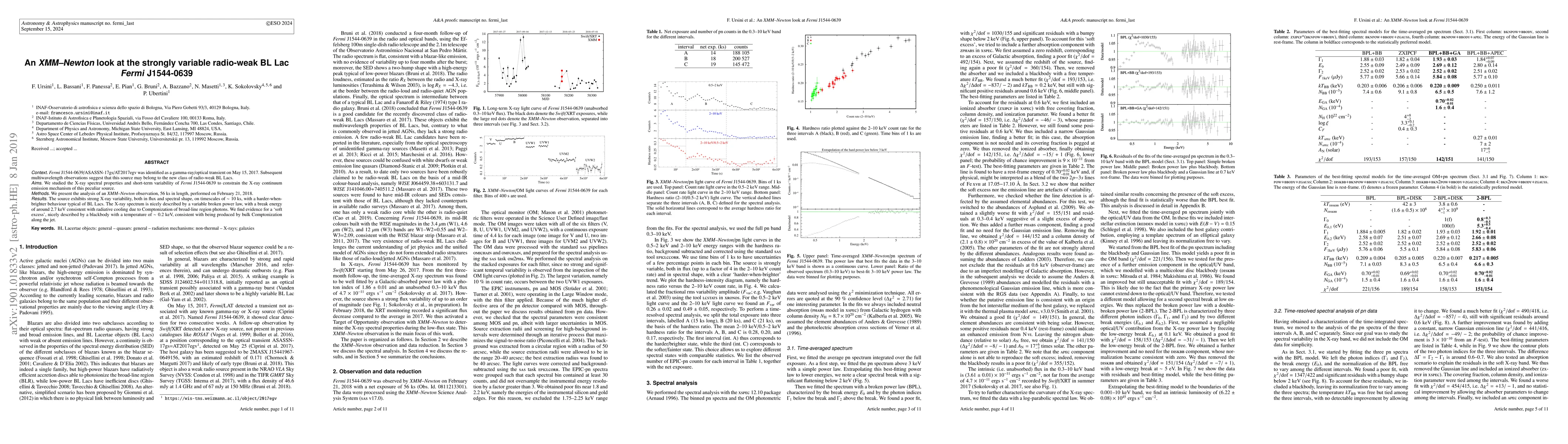 Fermi J1544-0639/ASASSN-17gs/AT2017egv was identified as a gamma-ray/optical transient on May 15, 2017. Subsequent multiwavelength observations suggest that this source may belong to the new class of radio-weak BL Lacs. We studied the X-ray spectral properties and short-term variability of Fermi J1544-0639 to constrain the X-ray continuum emission mechanism of this peculiar source. We present the analysis of an XMM-Newton observation, 56 ks in length, performed on February 21, 2018. The source exhibits strong X-ray variability, both in flux and spectral shape, on timescales of ~10 ks, with a harder-when-brighter behaviour typical of BL Lacs. The X-ray spectrum is nicely described by a variable broken power law, with a break energy of around 2.7 keV consistent with radiative cooling due to Comptonization of broad-line region photons. We find evidence for a `soft excess', nicely described by a blackbody with a temperature of ~0.2 keV, consistent with being produced by bulk Comptonization along the jet.