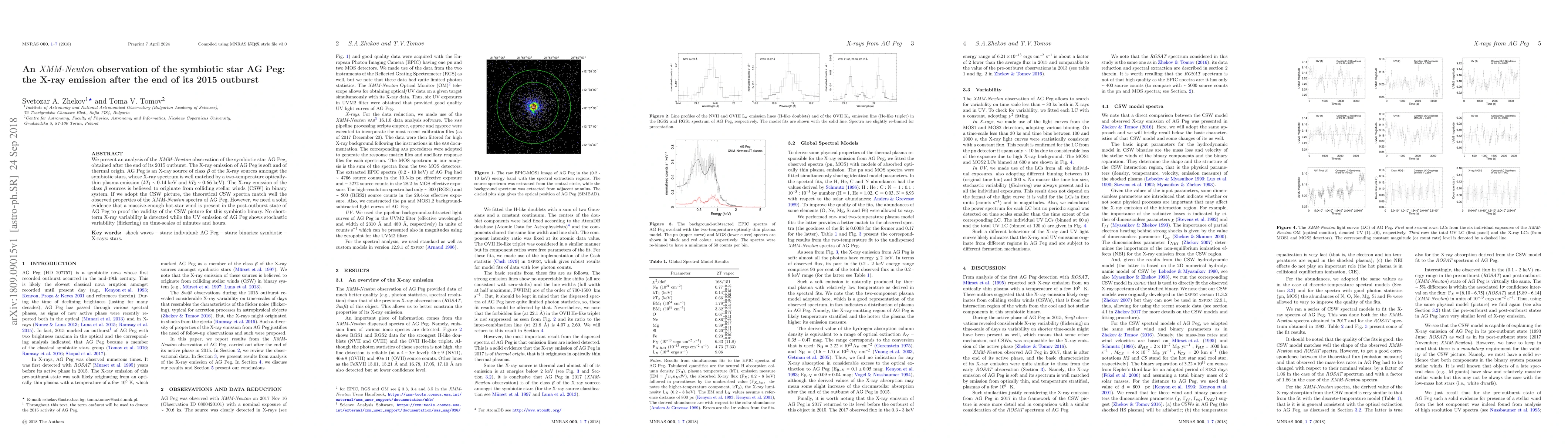This paper analyzes XMM-Newton observations of the symbiotic star AG Peg post its 2015 outburst, revealing soft, thermal X-ray emission consistent with a two-temperature plasma, indicative of colliding stellar winds. No short-term X-ray variability is detected, but UV emission shows stochastic variability.