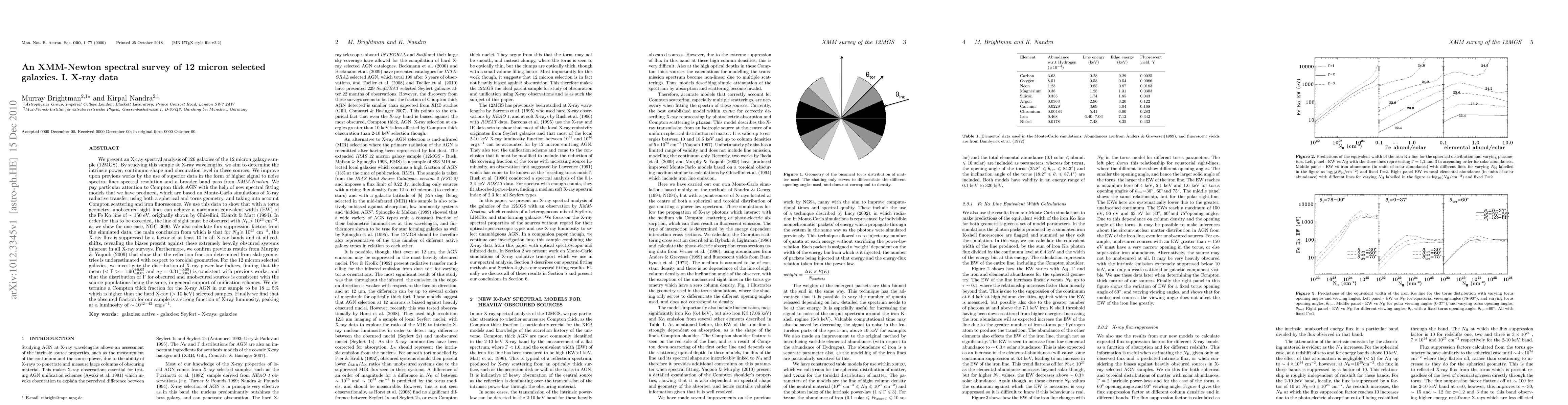 We present an X-ray spectral analysis of 126 galaxies of the 12 micron galaxy sample. We pay particular attention to Compton thick AGN with the help of new spectral fitting models that we have produced, which are based on Monte-Carlo simulations of X-ray radiative transfer, using both a spherical and torus geometry, and taking into account Compton scattering and Fe fluorescence. We use this data to show that with a torus geometry, unobscured sight lines can achieve a maximum EW of the Fe K\alpha line of ~150 eV, originally shown by Ghisellini, Haardt & Matt (1994). In order for this to be exceeded, the line of sight must be obscured with N_H>10^23 cm^-2, as we show for one case, NGC 3690. We also calculate flux suppression factors from the simulated data, the main conclusion from which is that for N_H>10^25 cm^-2, the X-ray flux is suppressed by a factor of >10 in all X-ray bands and at all redshifts, revealing the biases present against these extremely heavily obscured systems inherent in all X-ray surveys. Furthermore, we confirm previous results from Murphy & Yaqoob (2009) that show that the reflection fraction determined from slab geometries is underestimated with respect to toroidal geometries. For the 12 micron selected galaxies, we investigate the distribution of X-ray power-law indices, finding that the mean $<\Gamma>=1.90_{-0.07}^{+0.05}$ and $\sigma_\Gamma = 0.31_{-0.05}^{+0.05}$) is consistent with previous works, and that the distribution of \Gamma for obscured and unobscured sources is consistent with the source populations being the same, in general support of unification schemes. We determine a Compton thick fraction for the X-ray AGN in our sample to be 18+/-5% which is higher than the hard X-ray (>10 keV) selected samples. Finally we find that the obscured fraction for our sample is a strong function of X-ray luminosity, peaking at L_X~10^42-43 ergs s^-1.