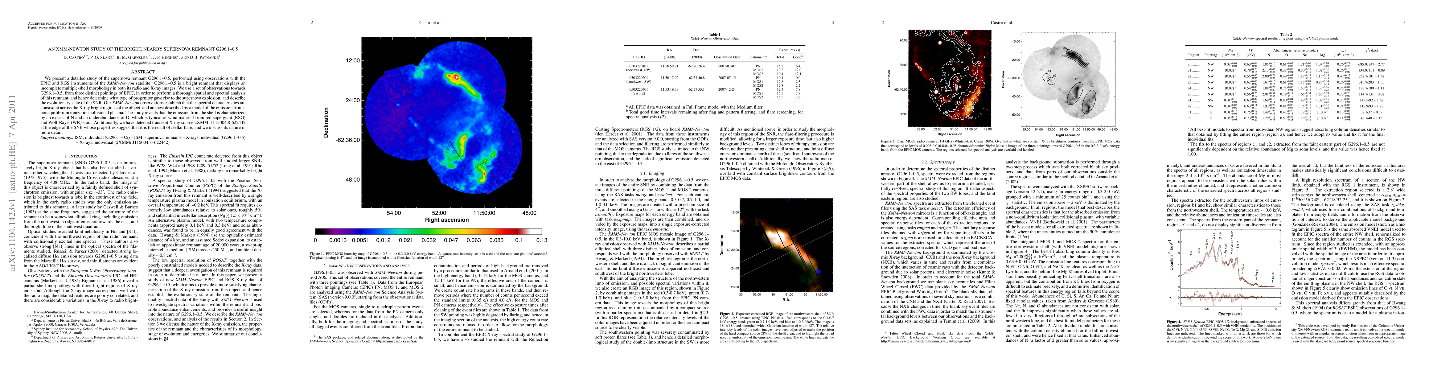 We present a detailed study of the supernova remnant G296.1-0.5, performed using observations with the EPIC and RGS instruments of the XMM-Newton satellite. G296.1-0.5 is a bright remnant that displays an incomplete multiple-shell morphology in both its radio and X-ray images. We use a set of observations towards G296.1-0.5, from three distinct pointings of EPIC, in order to perform a thorough spatial and spectral analysis of this remnant, and hence determine what type of progenitor gave rise to the supernova explosion, and describe the evolutionary state of the SNR. Our XMM-Newton observations establish that the spectral characteristics are consistent across the X-ray bright regions of the object, and are best described by a model of the emission from a nonequilibrium ionization collisional plasma. The study reveals that the emission from the shell is characterized by an excess of N and an underabundance of O, which is typical of wind material from red supergiant (RSG) and Wolf-Rayet (WR) stars. Additionally, we have detected transient X-ray source 2XMMi J115004.8-622442 at the edge of the SNR whose properties suggest that it is the result of stellar flare, and we discuss its nature in more detail.