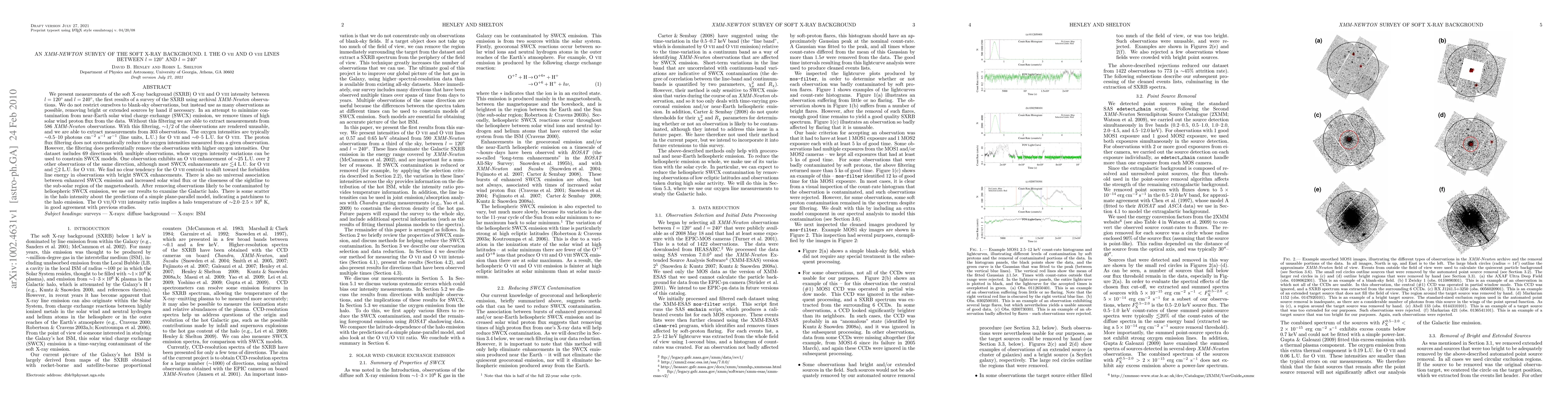 We present measurements of the soft X-ray background (SXRB) O VII and O VIII intensity between $l = 120\degr$ and $l = 240\degr$, the first results of a survey of the SXRB using archival XMM-Newton observations. We do not restrict ourselves to blank-sky observations, but instead use as many observations as possible, removing bright or extended sources by hand if necessary. The oxygen intensities are typically ~0.5-10 photons/cm^2/s/sr (line units, L.U.) for O VII and ~0-5 L.U. for O VIII. Our dataset includes 69 directions with multiple observations, whose oxygen intensity variations can be used to constrain SWCX models. One observation exhibits an O VII enhancement of ~25 L.U. over 2 other observations of the same direction, although most SWCX enhancements are $\la 4$ L.U. for O VII and $\la 2$ L.U. for O VIII. We find no clear tendency for the O VII centroid to shift toward the forbidden line energy in observations with bright SWCX enhancements. There is also no universal association between enhanced SWCX emission and increased solar wind flux or the closeness of the sightline to the sub-solar region of the magnetosheath. After removing observations likely to be contaminated by heliospheric SWCX emission, we use our results to examine the Galactic halo. There is some scatter in the halo intensity about the predictions of a simple plane-parallel model, indicating a patchiness to the halo emission. The O VII/O VIII intensity ratio implies a halo temperature of ~2.0-2.5 MK, in good agreement with previous studies. (Abridged)