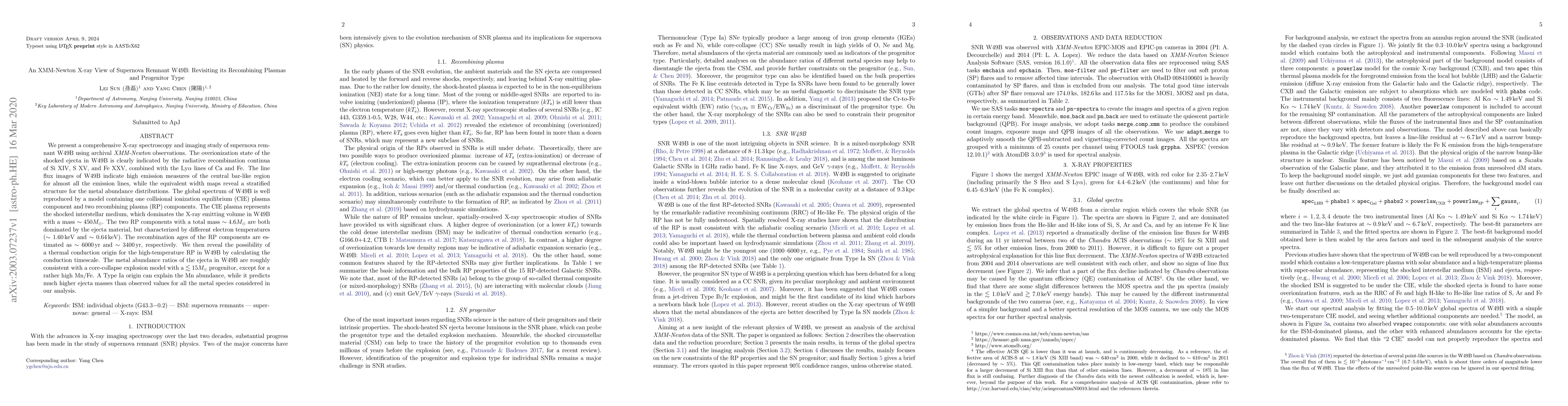 This study uses XMM-Newton X-ray observations to analyze the recombination states in supernova remnant W49B, revealing a complex structure with distinct plasma components. The findings suggest a core-collapse progenitor with a mass of $\lesssim15M_\odot$, though a Type Ia supernova could explain some anomalies in metal abundances.