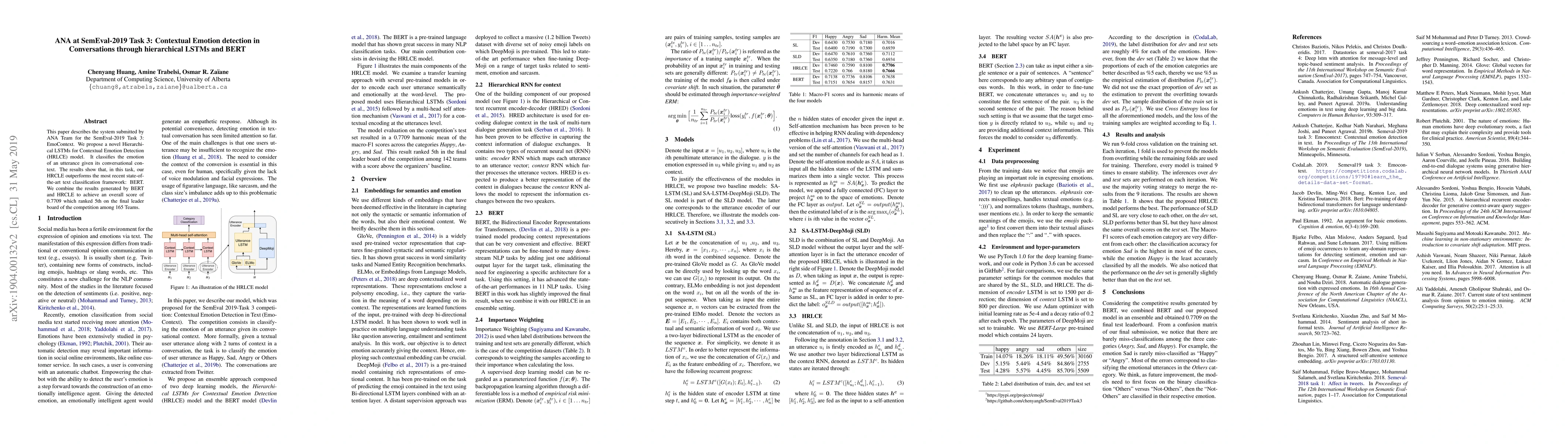 The ANA Team developed a Hierarchical LSTMs for Contextual Emotion Detection (HRLCE) model for the SemEval-2019 Task 3, outperforming BERT in emotion classification within conversations. Combining HRLCE and BERT results led to a final score of 0.7709, ranking 5th among 165 teams.