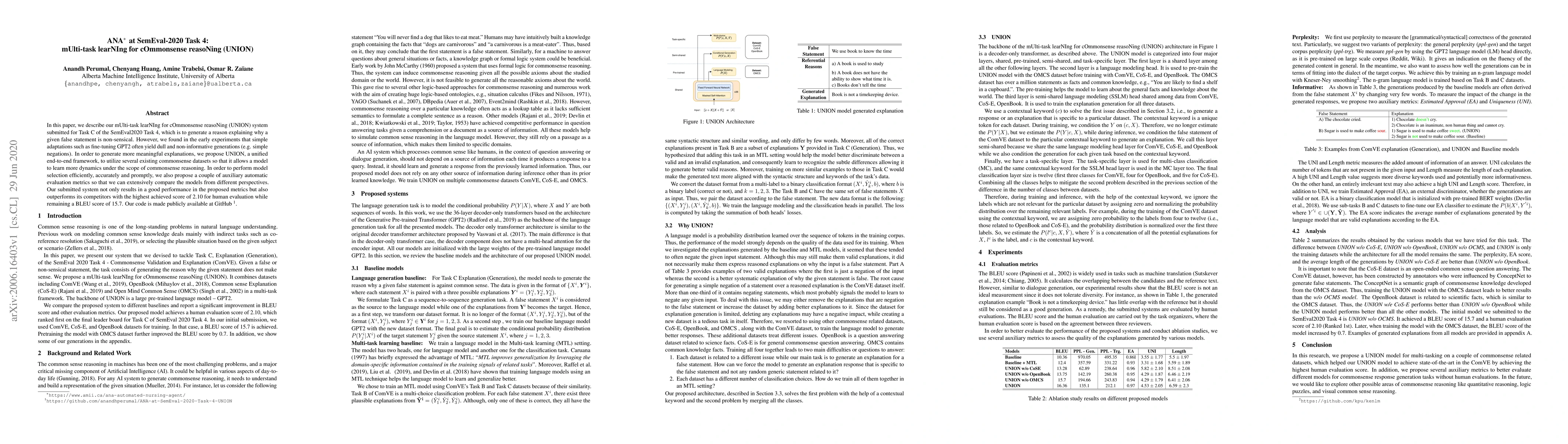 This paper presents UNION, a multi-task learning framework for commonsense reasoning, designed to generate insightful explanations for nonsensical statements. The system outperforms competitors using auxiliary evaluation metrics and achieves a high human evaluation score of 2.10.