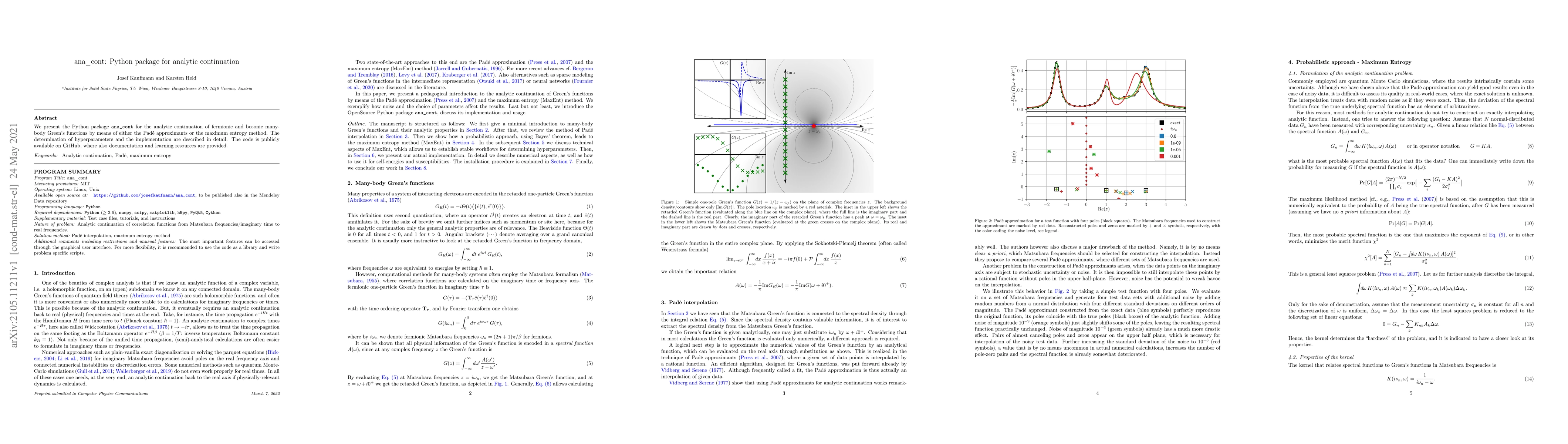 The ana_cont Python package facilitates analytic continuation of many-body Green's functions using Pade approximants or the maximum entropy method. It includes detailed hyperparameter determination and is publicly available on GitHub with documentation and learning resources.