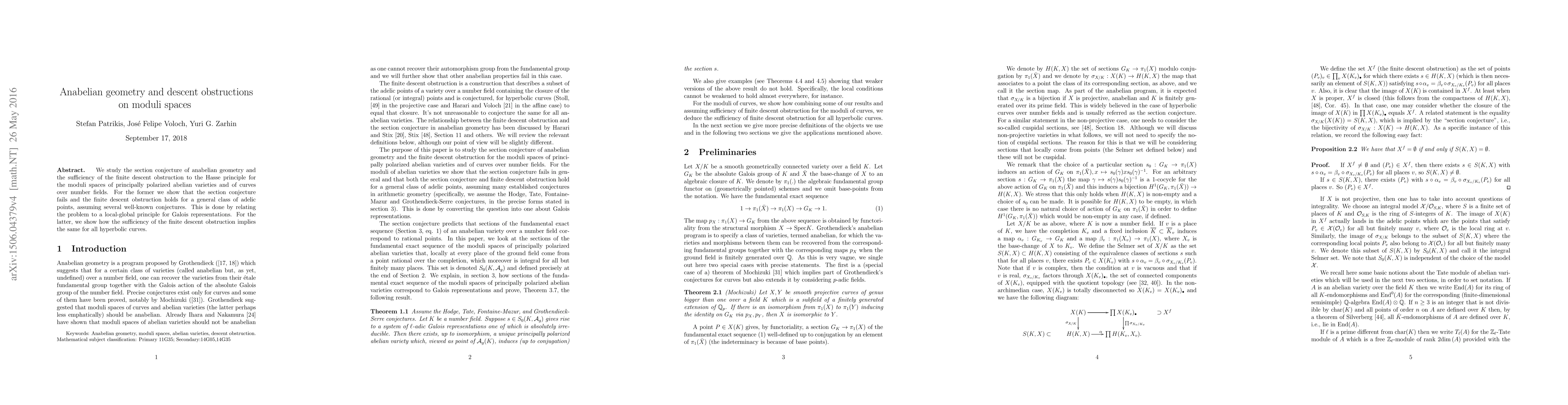 This paper investigates the section conjecture in anabelian geometry and the effectiveness of finite descent obstructions for the Hasse principle concerning moduli spaces of abelian varieties and curves over number fields. It reveals that the section conjecture fails but the finite descent obstruction holds for certain adelic points, supported by a local-global principle for Galois representations. Partial results suggest the finite descent obstruction suffices for curves, extending this to hyperbolic curves.