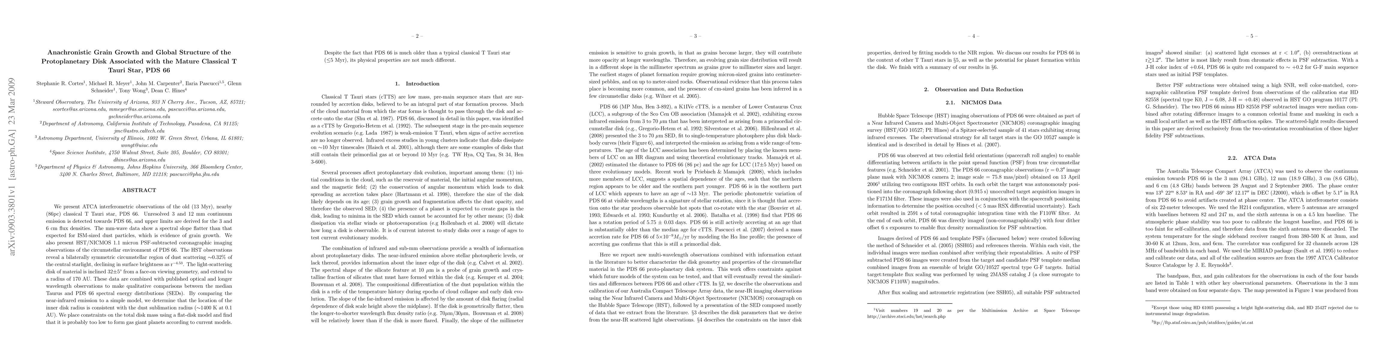 We present ATCA interferometric observations of the old (13 Myr), nearby (86pc) classical T Tauri star, PDS 66. Unresolved 3 and 12 mm continuum emission is detected towards PDS 66, and upper limits are derived for the 3 and 6 cm flux densities. The mm-wave data show a spectral slope flatter than that expected for ISM-sized dust particles, which is evidence of grain growth. We also present HST/NICMOS 1.1 micron PSF-subtracted coronagraphic imaging of PDS 66. The HST observations reveal a bilaterally symmetric circumstellar region of dust scattering about 0.32% of the central starlight, declining radially in surface brightness. The light-scattering disk of material is inclined 32 degrees from face-on, and extends to a radius of 170 AU. These data are combined with published optical and longer wavelength observations to make qualitative comparisons between the median Taurus and PDS 66 spectral energy distributions (SEDs). By comparing the near-infrared emission to a simple model, we determine that the location of the inner disk radius is consistent with the dust sublimation radius (1400 K at 0.1 AU). We place constraints on the total disk mass using a flat-disk model and find that it is probably too low to form gas giant planets according to current models. Despite the fact that PDS 66 is much older than a typical classical T Tauri star (< 5 Myr), its physical properties are not much different.
