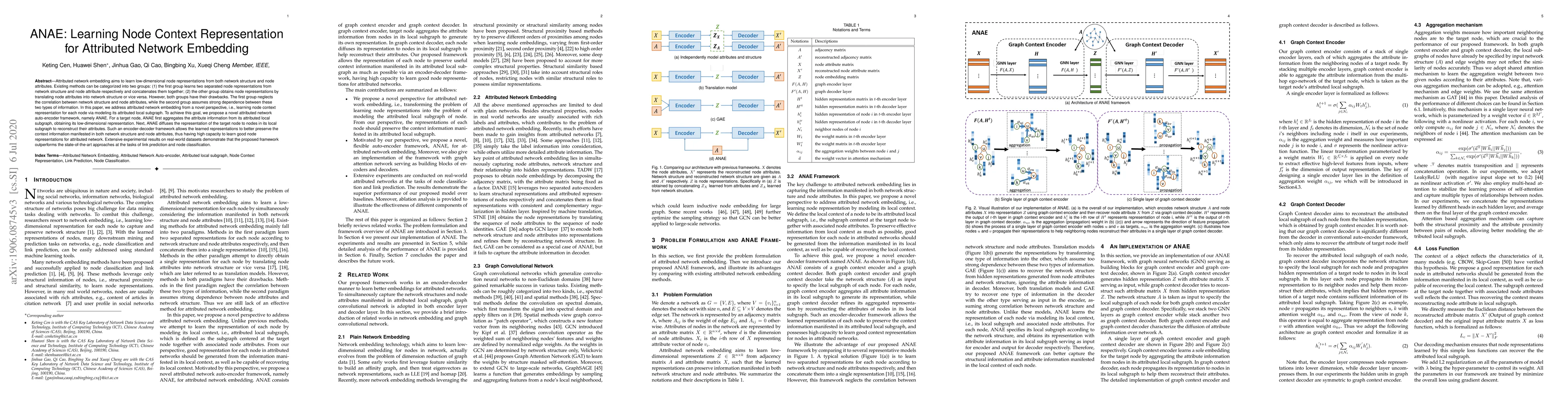The paper proposes ANAE, an attributed network auto-encoder framework that learns node context representation by modeling each node's attributed local subgraph, aiming to better integrate network structure and node attributes. Experimental results show ANAE outperforms existing methods in link prediction and node classification tasks.