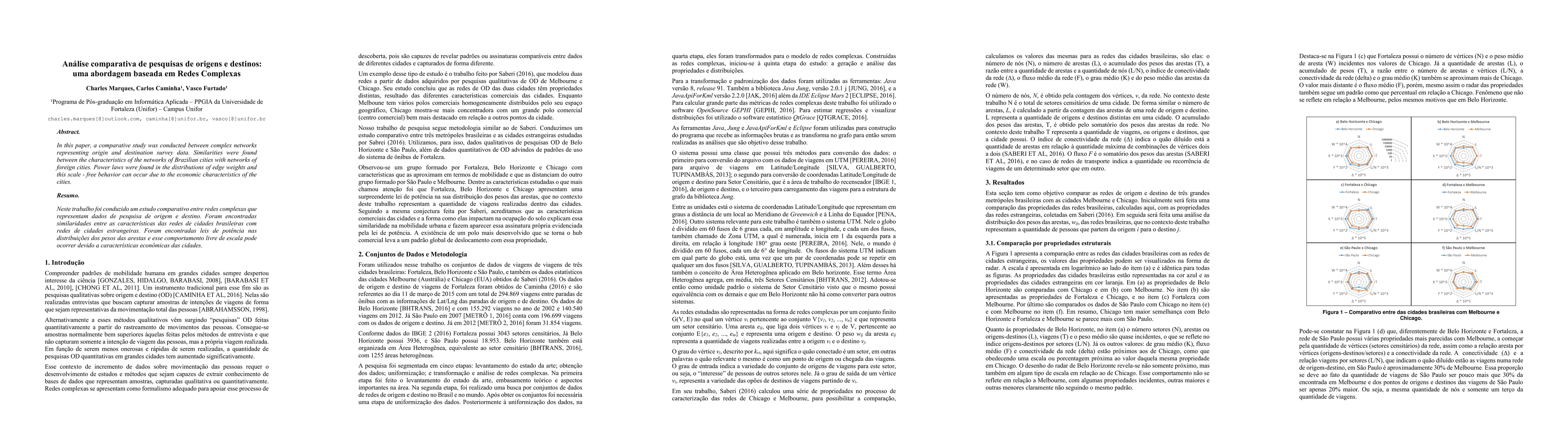 In this paper, a comparative study was conducted between complex networks representing origin and destination survey data. Similarities were found between the characteristics of the networks of Brazilian cities with networks of foreign cities. Power laws were found in the distributions of edge weights and this scale - free behavior can occur due to the economic characteristics of the cities.