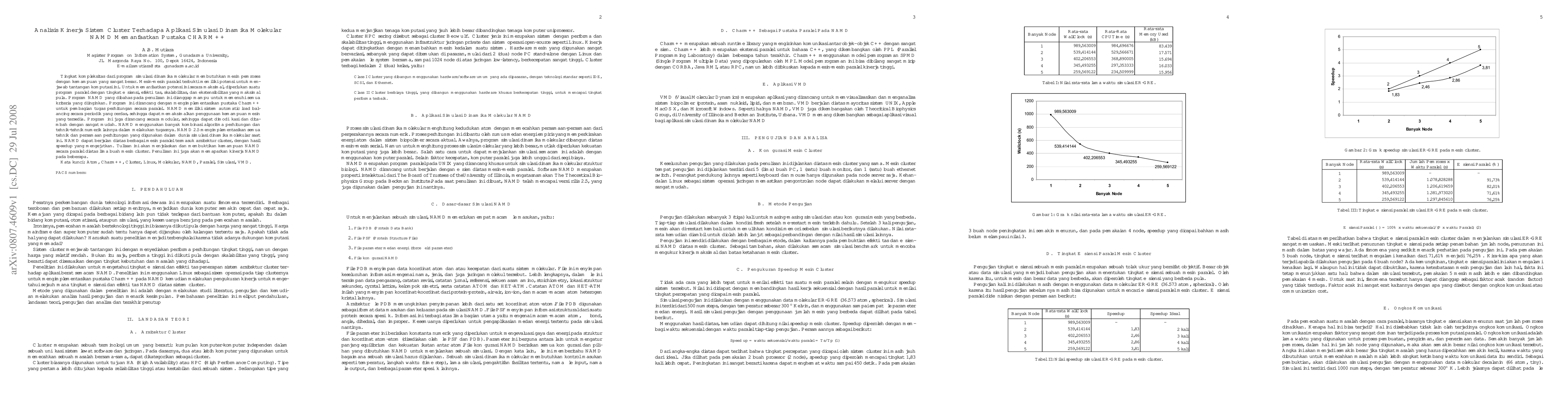 Tingkat kompleksitas dari program simulasi dinamika molekular membutuhkan mesin pemroses dengan kemampuan yang sangat besar. Mesin-mesin paralel terbukti memiliki potensi untuk menjawab tantangan komputasi ini. Untuk memanfaatkan potensi ini secara maksimal, diperlukan suatu program paralel dengan tingkat efisiensi, efektifitas, skalabilitas, dan ekstensibilitas yang maksimal pula. Program NAMD yang dibahas pada penulisan ini dianggap mampu untuk memenuhi semua kriteria yang diinginkan. Program ini dirancang dengan mengimplementasikan pustaka Charm++ untuk pembagian tugas perhitungan secara paralel. NAMD memiliki sistem automatic load balancing secara periodik yang cerdas, sehingga dapat memaksimalkan penggunaan kemampuan mesin yang tersedia. Program ini juga dirancang secara modular, sehingga dapat dimodifikasi dan ditambah dengan sangat mudah. NAMD menggunakan banyak kombinasi algoritma perhitungan dan tehnik-tehnik numerik lainnya dalam melakukan tugasnya. NAMD 2.5 mengimplementasikan semua tehnik dan persamaan perhitungan yang digunakan dalam dunia simulasi dinamika molekular saat ini. NAMD dapat berjalan diatas berbagai mesin paralel termasuk arsitektur cluster, dengan hasil speedup yang mengejutkan. Tulisan ini akan menjelaskan dan membuktikan kemampuan NAMD secara paralel diatas lima buah mesin cluster. Penulisan ini juga akan memaparkan kinerja NAMD pada beberapa.