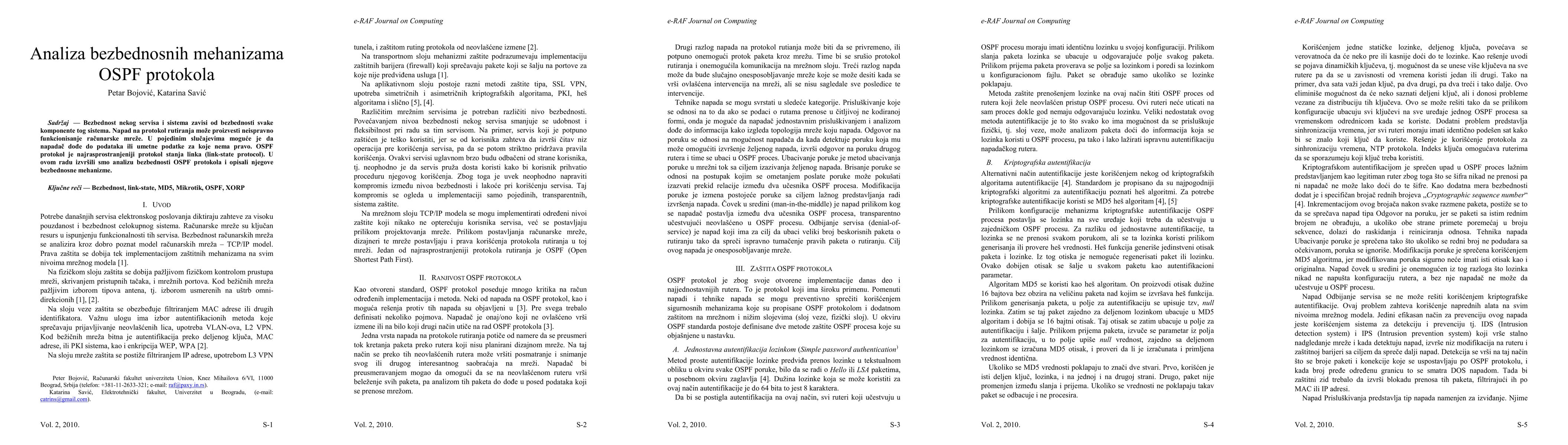 This paper analyzes the security mechanisms of the widely-used OSPF (Open Shortest Path First) routing protocol, identifying potential vulnerabilities that could lead to unauthorized data access or network malfunction. It describes these security measures and their implications for network safety.