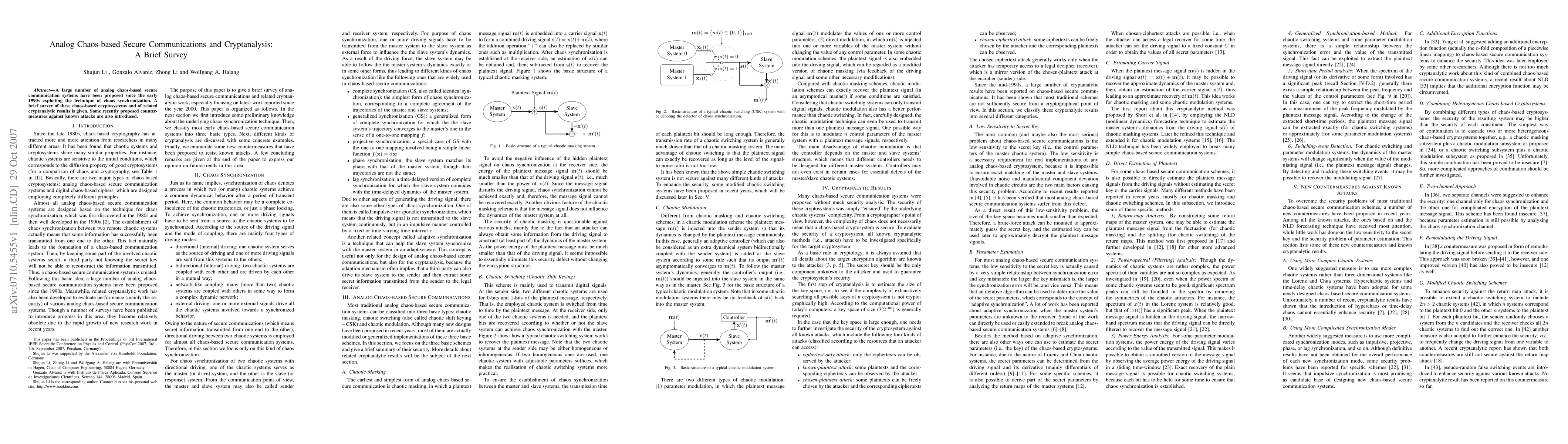 A large number of analog chaos-based secure communication systems have been proposed since the early 1990s exploiting the technique of chaos synchronization. A brief survey of these chaos-based cryptosystems and of related cryptanalytic results is given. Some recently proposed countermeasures against known attacks are also introduced.