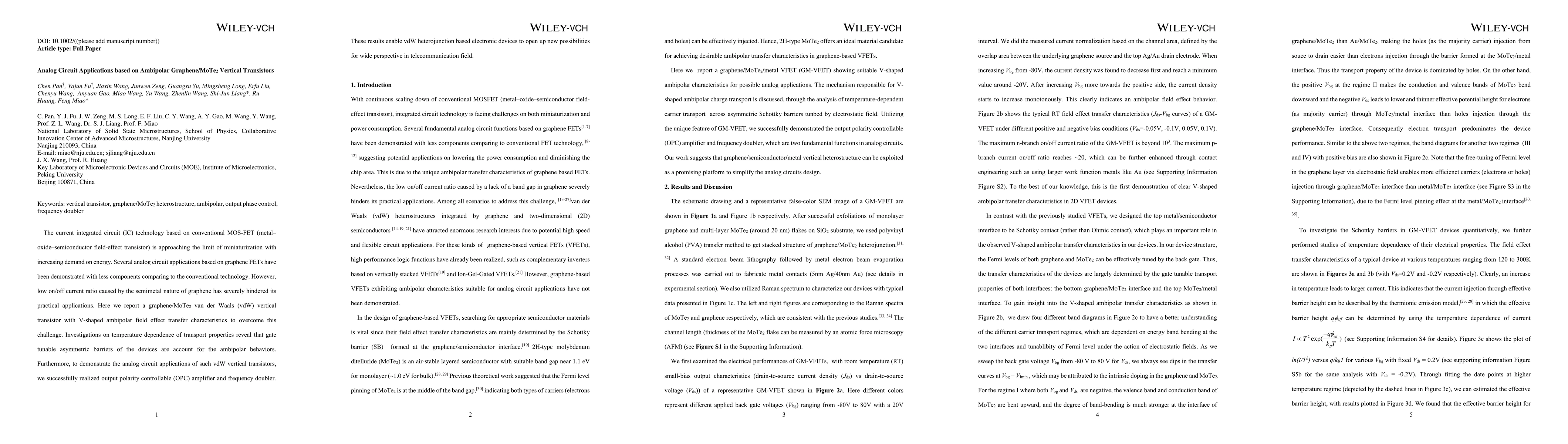 This paper reports on ambipolar graphene/MoTe2 vertical transistors that overcome the low on/off current ratio issue of graphene, enabling analog circuit applications. The study demonstrates output polarity controllable amplifiers and frequency doublers, showcasing potential for advanced telecommunication technologies.