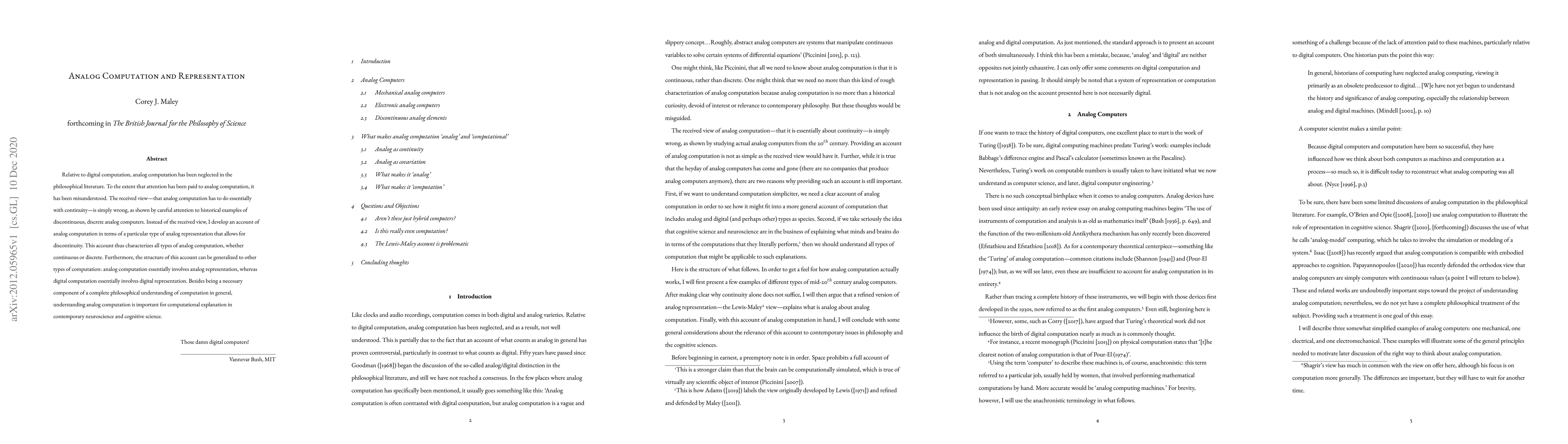 This paper argues that analog computation, often misunderstood as inherently continuous, can also be discrete and involves a specific type of analog representation. The author proposes a generalized account applicable to both continuous and discrete analog computations, emphasizing the importance of this understanding for computational explanations in neuroscience and cognitive science.