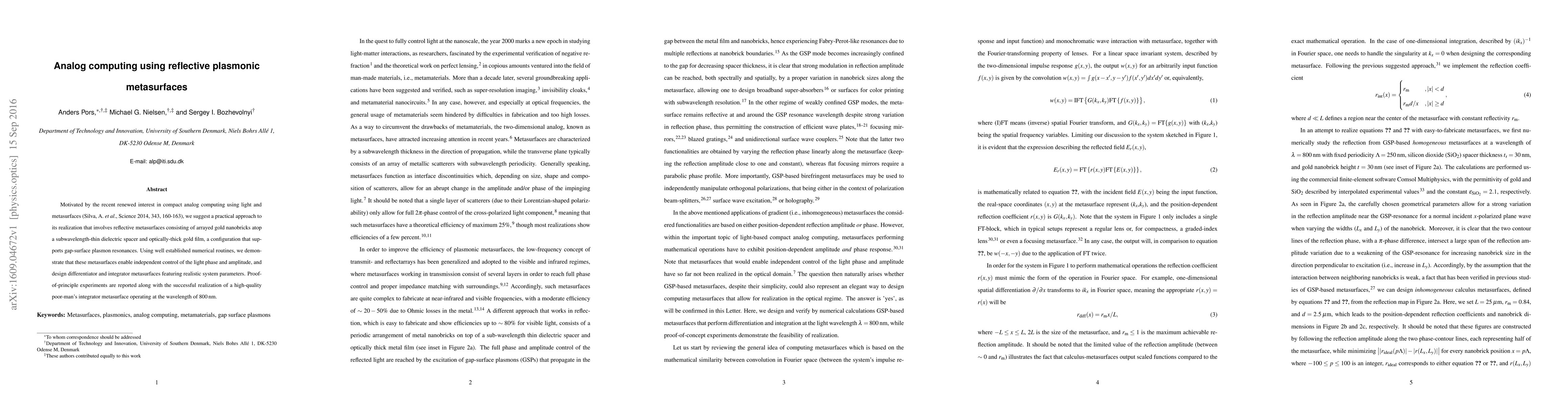 This paper proposes a reflective plasmonic metasurface using gold nanobricks for compact analog computing with light, demonstrating control over light phase and amplitude. Experimental validation shows successful realization of a high-quality integrator metasurface operating at 800 nm.