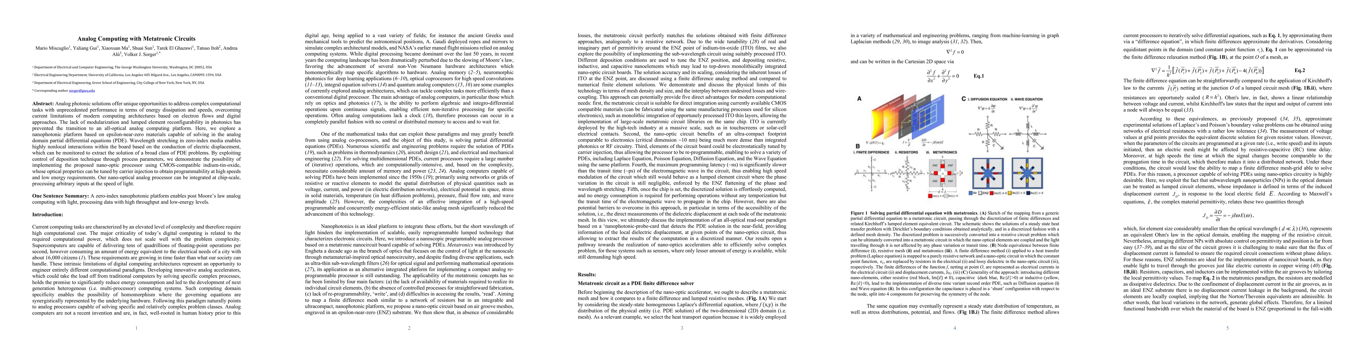 Analog photonic solutions offer unique opportunities to address complex computational tasks with unprecedented performance in terms of energy dissipation and speeds, overcoming current limitations of modern computing architectures based on electron flows and digital approaches. The lack of modularization and lumped element reconfigurability in photonics has prevented the transition to an all-optical analog computing platform. Here, we explore a nanophotonic platform based on epsilon-near-zero materials capable of solving in the analog domain partial differential equations (PDE). Wavelength stretching in zero-index media enables highly nonlocal interactions within the board based on the conduction of electric displacement, which can be monitored to extract the solution of a broad class of PDE problems. By exploiting control of deposition technique through process parameters, we demonstrate the possibility of implementing the proposed nano-optic processor using CMOS-compatible indium-tin-oxide, whose optical properties can be tuned by carrier injection to obtain programmability at high speeds and low energy requirements. Our nano-optical analog processor can be integrated at chip-scale, processing arbitrary inputs at the speed of light.