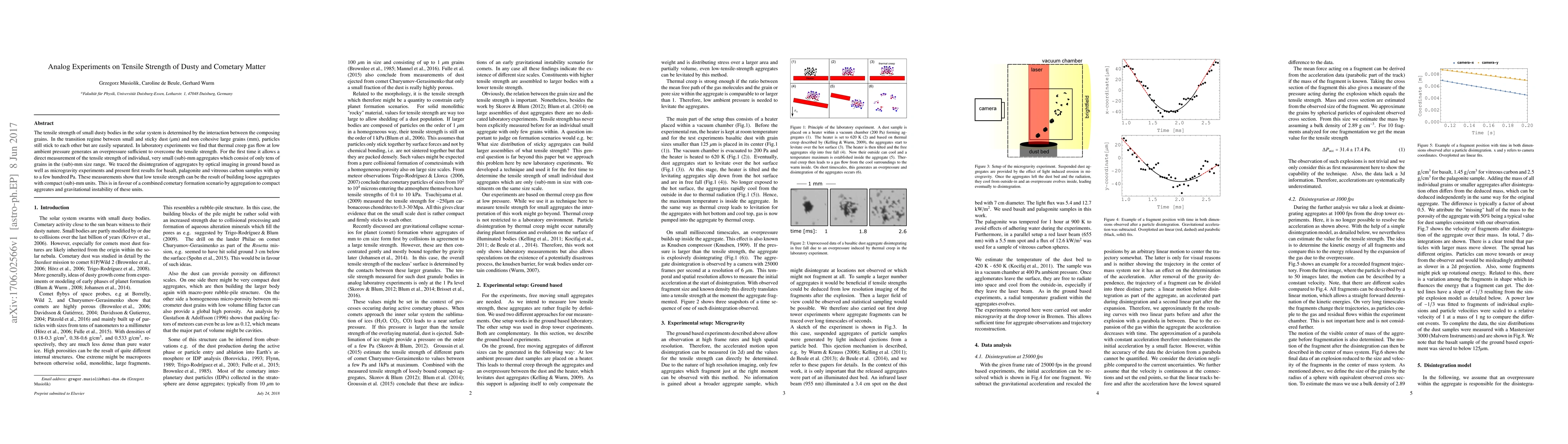 This study investigates the tensile strength of small dusty aggregates in the solar system, finding that thermal creep gas flow can generate enough overpressure to disintegrate them. Initial results from experiments on basalt, palagonite, and vitreous carbon show low tensile strength due to loose aggregation of compact units, supporting a formation scenario involving both aggregation and gravitational instability.