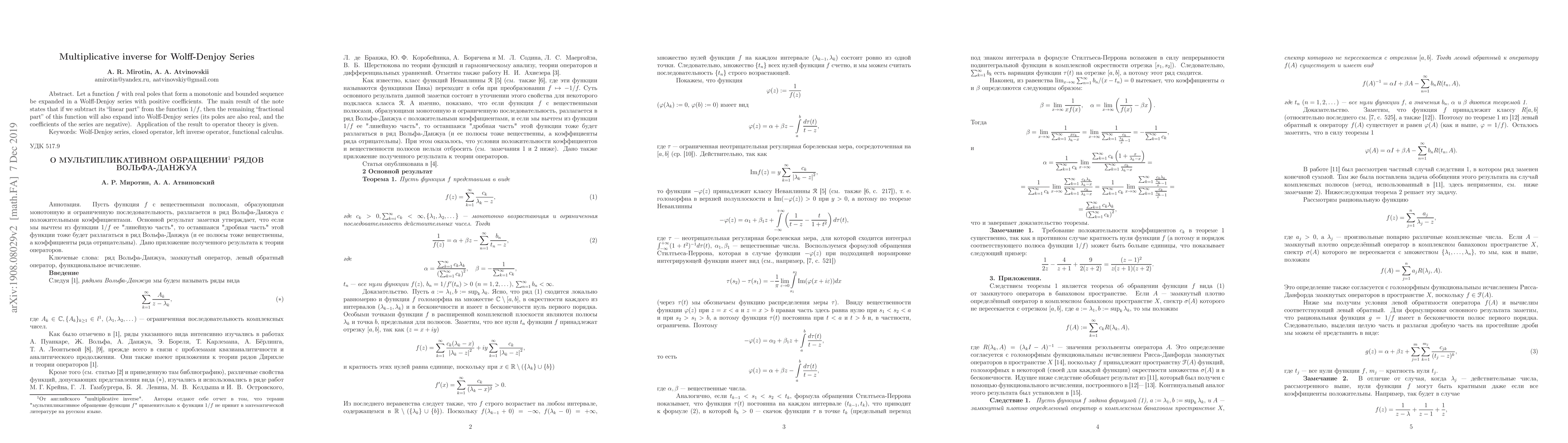 This paper establishes an analogue of the Wiener lemma for Wolff-Denjoy series, showing that subtracting the linear part from 1/f results in a fractional part that also expands into a Wolff-Denjoy series with negative coefficients, with real poles. Applications to operator theory are discussed.