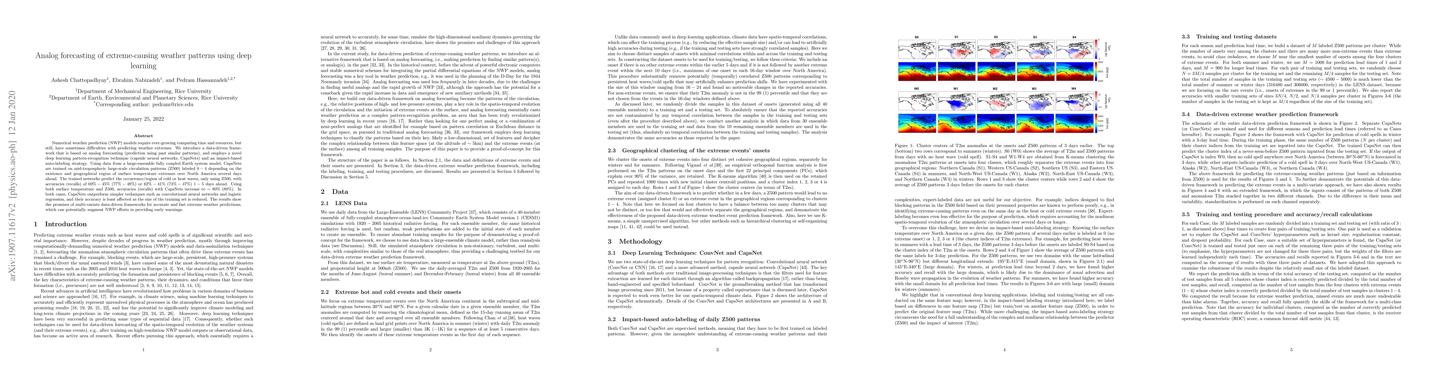 This paper proposes a deep learning framework using capsule neural networks for analog forecasting of extreme weather patterns, achieving accuracies of 69%-88% in predicting cold or heat waves up to 5 days ahead. The method outperforms traditional techniques and shows promise when combining multi-modal data for enhanced prediction accuracy.