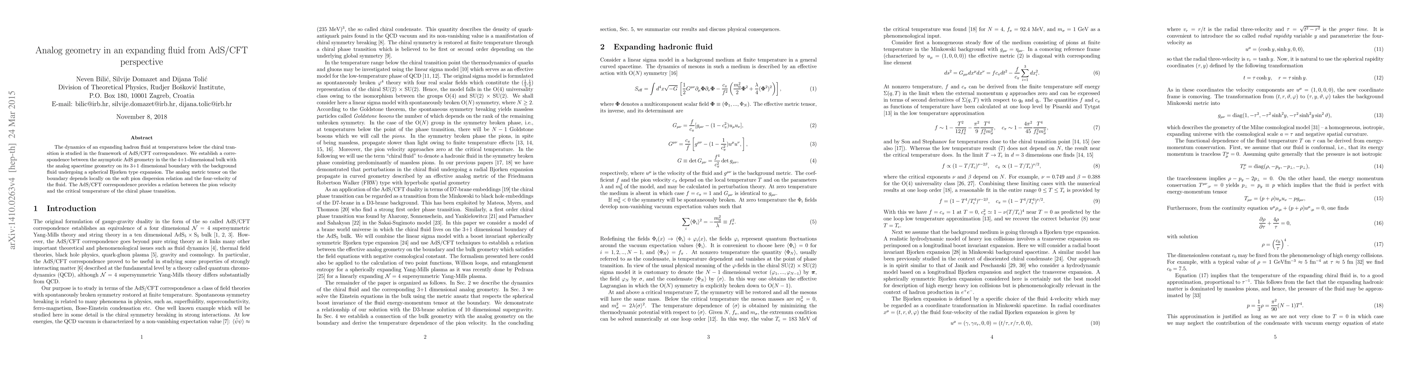 This paper explores the dynamics of an expanding hadron fluid using the AdS/CFT correspondence, establishing a link between the asymptotic AdS geometry and the analog spacetime geometry on its boundary, with implications for the pion velocity and the critical temperature of the chiral phase transition.