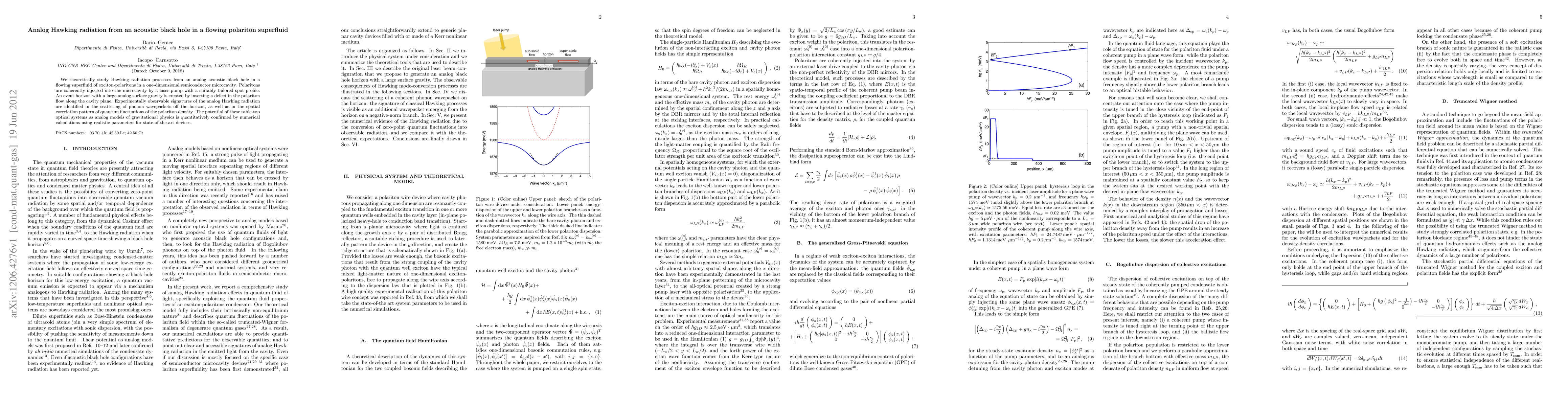 This paper theoretically explores Hawking radiation analogs in a flowing exciton-polariton superfluid, identifying observable signatures in phonon scattering and polariton density fluctuations. Numerical simulations confirm the feasibility of these table-top optical systems as models for gravitational physics.