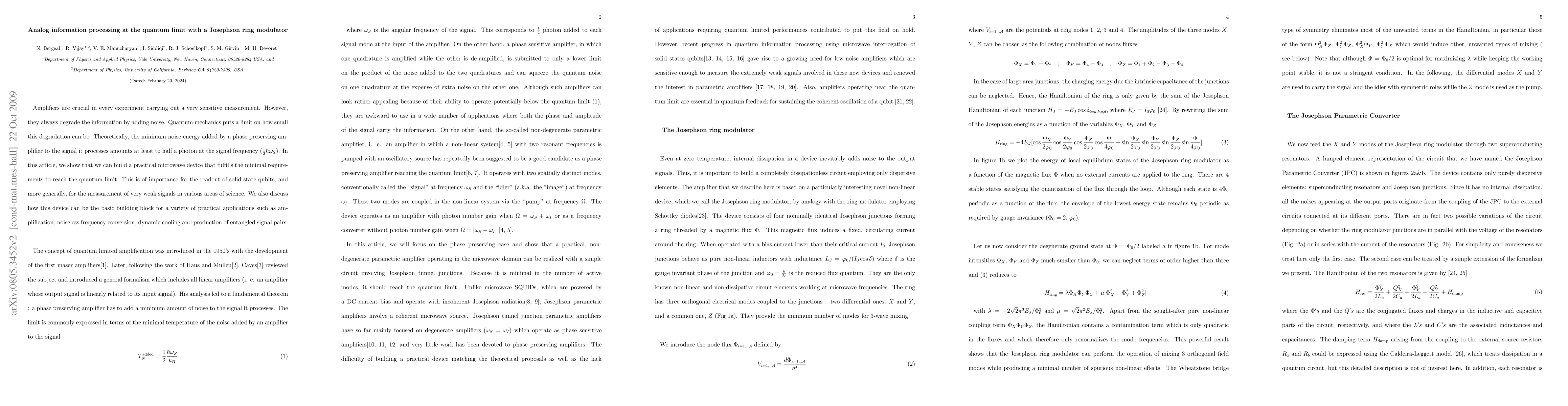 This paper demonstrates a Josephson ring modulator that achieves the quantum limit in noise reduction, essential for sensitive measurements and readout of solid-state qubits. The device can also serve as a foundational component for applications like amplification, noiseless frequency conversion, and entangled signal pair production.