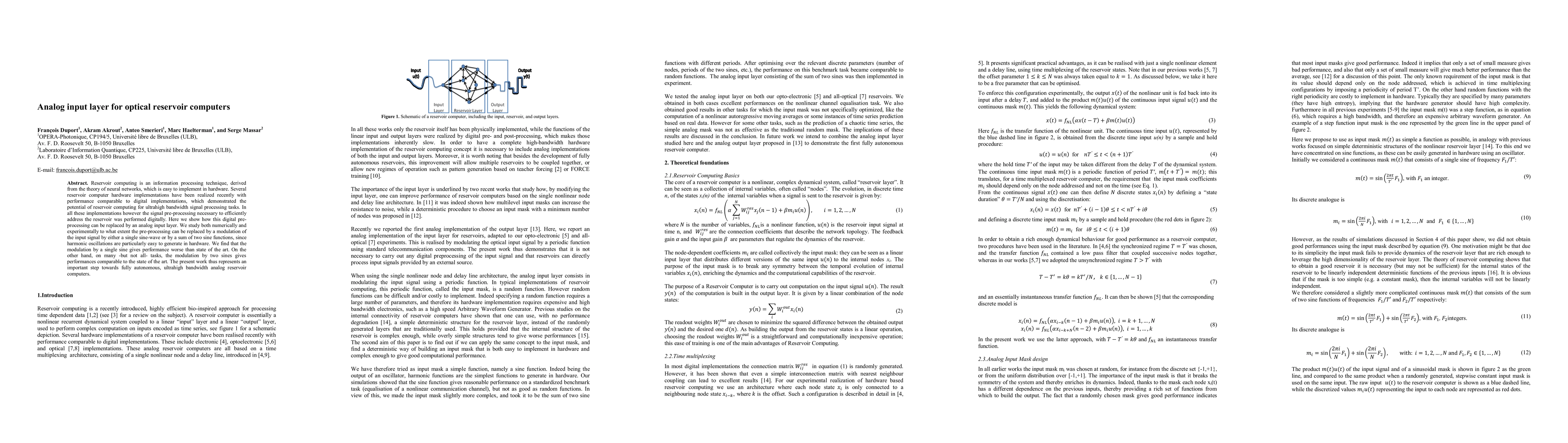 This paper explores replacing digital pre-processing in optical reservoir computers with an analog input layer, demonstrating that modulation by a sum of two sine functions can achieve performance comparable to state-of-the-art digital methods, advancing the development of fully autonomous, high-bandwidth analog reservoir computing systems.