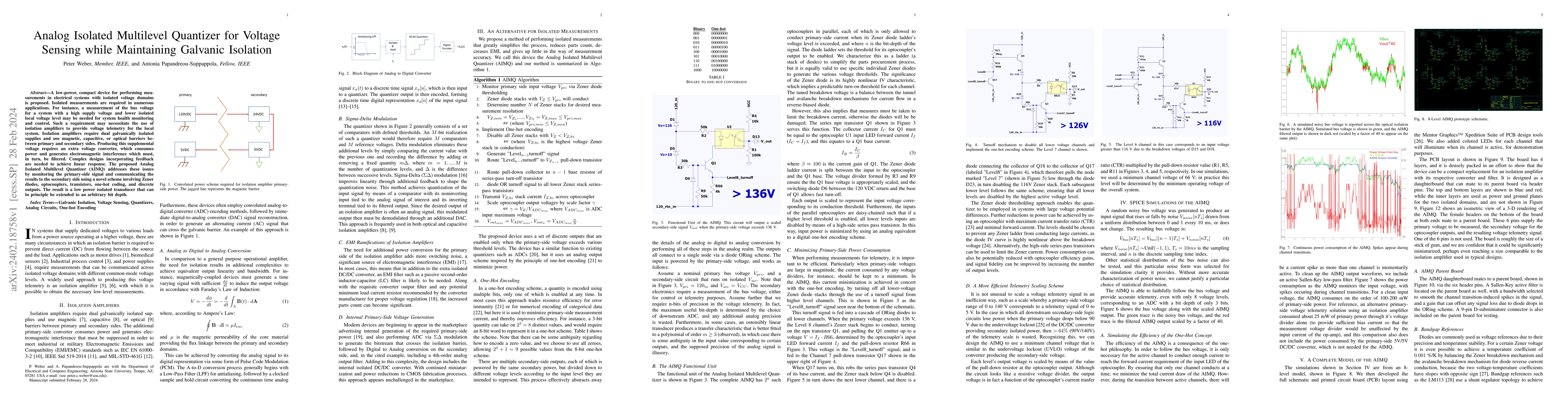 The paper proposes an Analog Isolated Multilevel Quantizer (AIMQ) for low-power, isolated voltage sensing using a novel scheme involving Zener diodes, optocouplers, and transistors, eliminating the need for extra voltage converters and associated power consumption and interference. The AIMQ provides a scalable solution for isolated voltage telemetry in high-voltage systems.