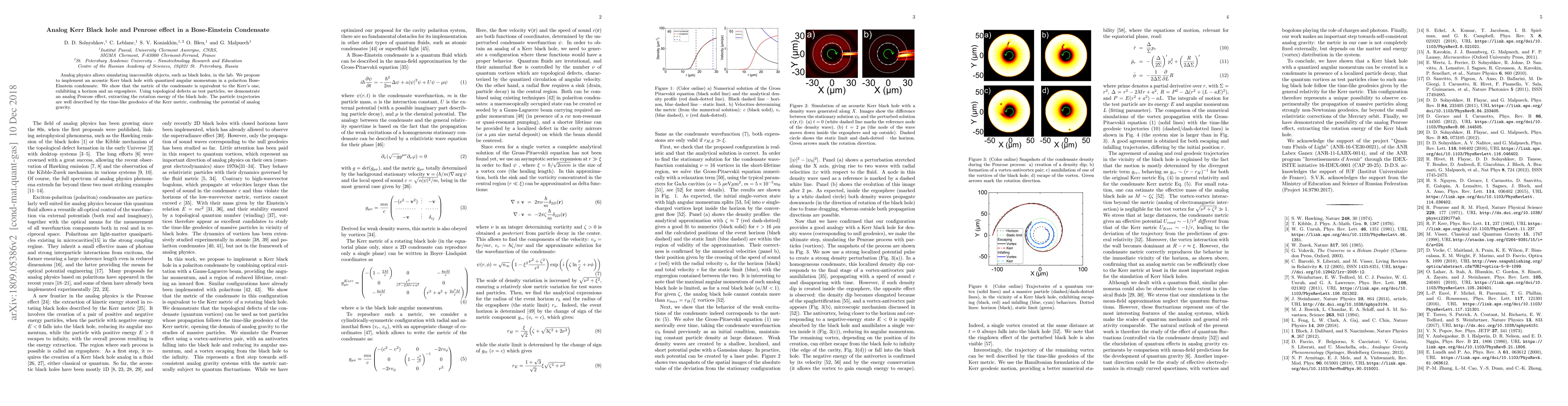 This paper proposes simulating an analog Kerr black hole in a Bose-Einstein condensate, demonstrating equivalence to the Kerr metric's horizon and ergosphere. It shows the analog Penrose effect by extracting rotation energy using topological defects, confirming the potential of analog gravity.