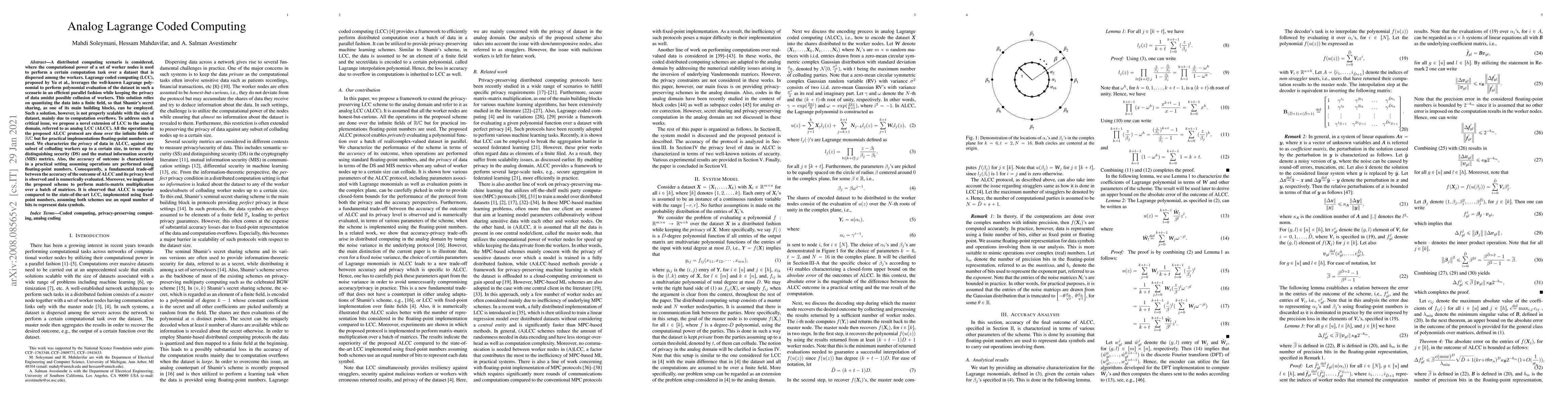 This paper introduces Analog Lagrange Coded Computing (ALCC), an extension of Lagrange Coded Computing (LCC) that addresses scalability issues by performing operations over infinite fields (R/C) using floating-point numbers. ALCC maintains data privacy against colluding workers and offers a trade-off between outcome accuracy and privacy level. The paper also presents a matrix-matrix multiplication implementation, demonstrating ALCC's superiority over state-of-the-art LCC with equal bit representation.