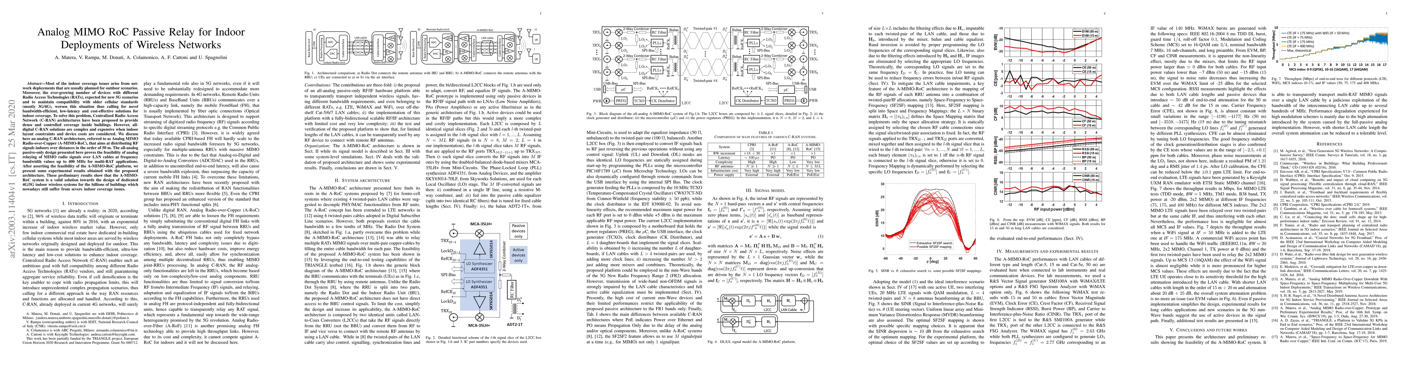 Most of the indoor coverage issues arise from network deployments that are usually planned for outdoor scenarios. Moreover, the ever-growing number of devices with different Radio Access Technologies (RATs), expected for new 5G scenarios and to maintain compatibility with older cellular standards (mostly 3G/4G), worsen this situation thus calling for novel bandwidth-efficient, low-latency and cost-effective solutions for indoor coverage. To solve this problem, Centralized Radio Access Network (C-RAN) architectures have been proposed to provide dense and controlled coverage inside buildings. However, all-digital C-RAN solutions are complex and expensive when indoor layout constraints and device costs are considered. We discuss here an analog C-RAN architecture, referred to as Analog MIMO Radio-over-Copper (A-MIMO-RoC), that aims at distributing RF signals indoors over distances in the order of 50 m. The all-analog passive-only design presented here proves the feasibility of analog relaying of MIMO radio signals over LAN cables at frequency bandwidth values up to 400 MHz for multi-RAT applications. After asserting the feasibility of the A-MIMO-RoC platform, we present some experimental results obtained with the proposed architecture. These preliminary results show that the A-MIMO-RoC system is a valid solution towards the design of dedicated 4G/5G indoor wireless systems for the billions of buildings which nowadays still suffer from severe indoor coverage issues.