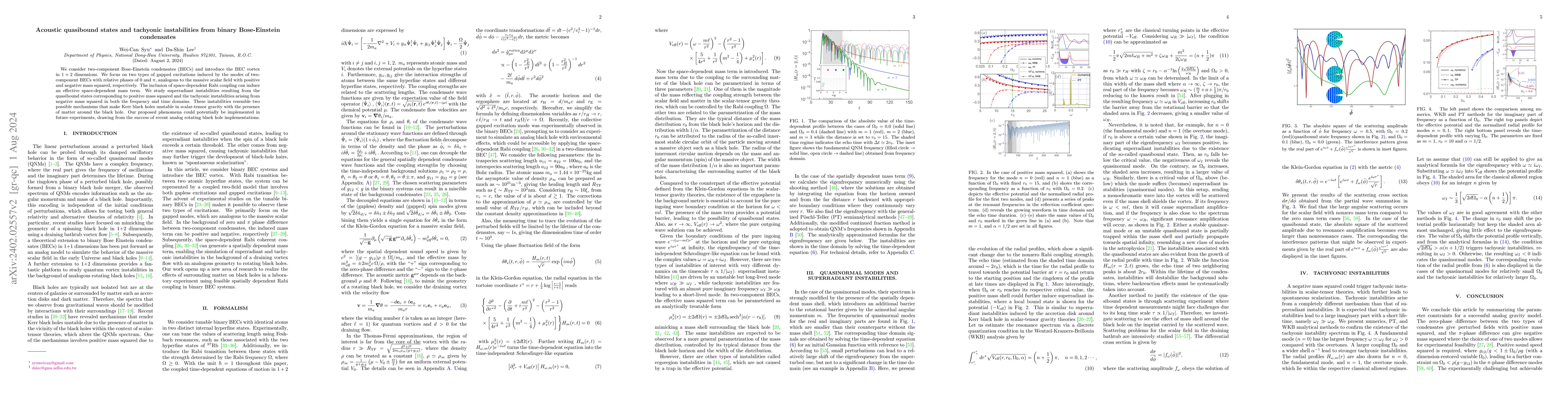 This paper proposes an analog model of Kerr black holes using binary Bose-Einstein condensates to study quasibound states and tachyonic instabilities. The model mimics the effects of scalar-tensor theories and explores superradiant and tachyonic instabilities, potentially aiding future experimental implementations.