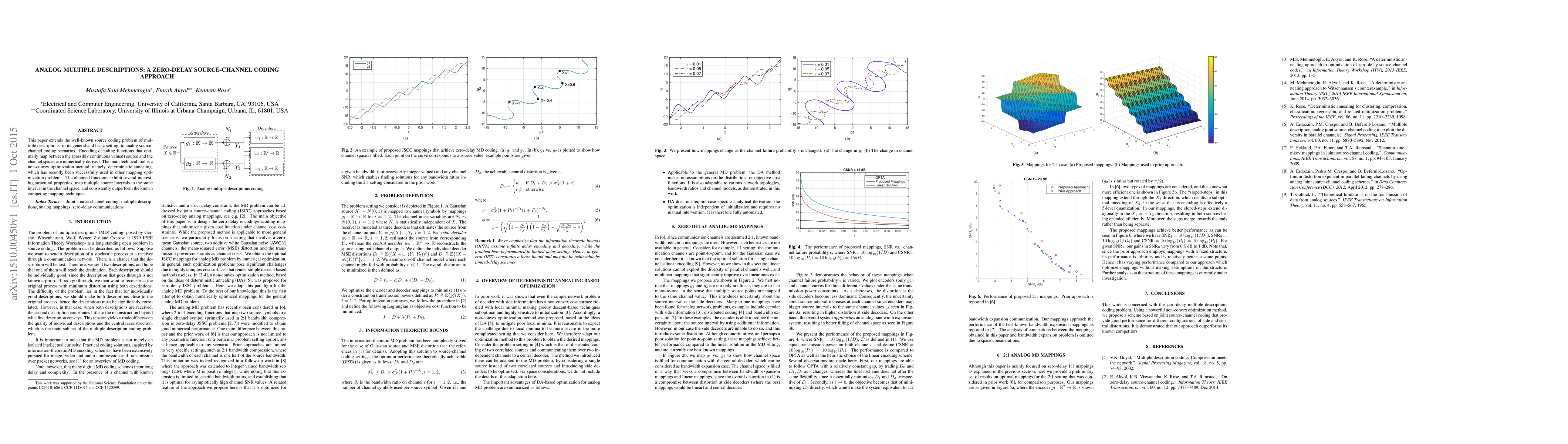This paper extends the well-known source coding problem of multiple descriptions, in its general and basic setting, to analog source-channel coding scenarios. Encoding-decoding functions that optimally map between the (possibly continuous valued) source and the channel spaces are numerically derived. The main technical tool is a non-convex optimization method, namely, deterministic annealing, which has recently been successfully used in other mapping optimization problems. The obtained functions exhibit several interesting structural properties, map multiple source intervals to the same interval in the channel space, and consistently outperform the known competing mapping techniques.