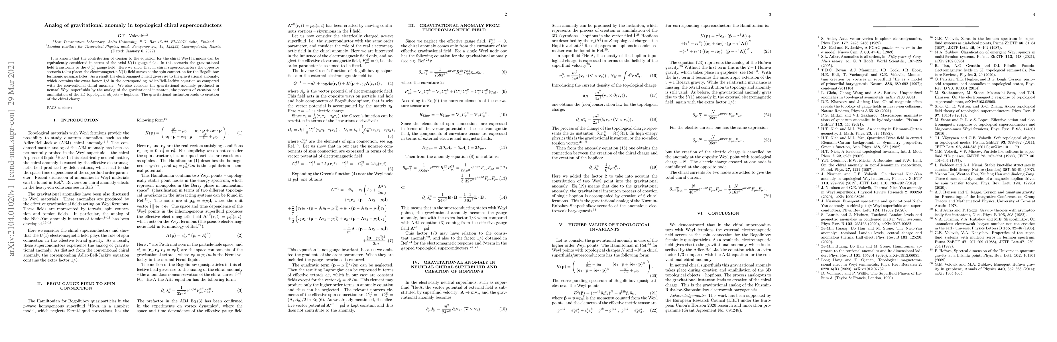 It is known that the contribution of torsion to the equation for the chiral Weyl fermions can be equivalently considered in terms of the axial $U(1)$ gauge field. In this scenario the gravitational field transforms to the $U(1)$ gauge field. Here we show that in chiral superconductors the opposite scenario takes place: the electromagnetic $U(1)$ field serves as the spin connection for the Bogoliubov fermionic quasiparticles. As a result the electromagnetic field gives rise to the gravitational anomaly, which contains the extra factor $1/3$ in the corresponding Adler-Bell-Jackiw equation as compared with the conventional chiral anomaly. We also consider the gravitational anomaly produced in neutral Weyl superfluids by the analog of the gravitational instanton, the process of creation and annihilation of the 3D topological objects -- hopfions. The gravitational instanton leads to creation of the chiral charge.